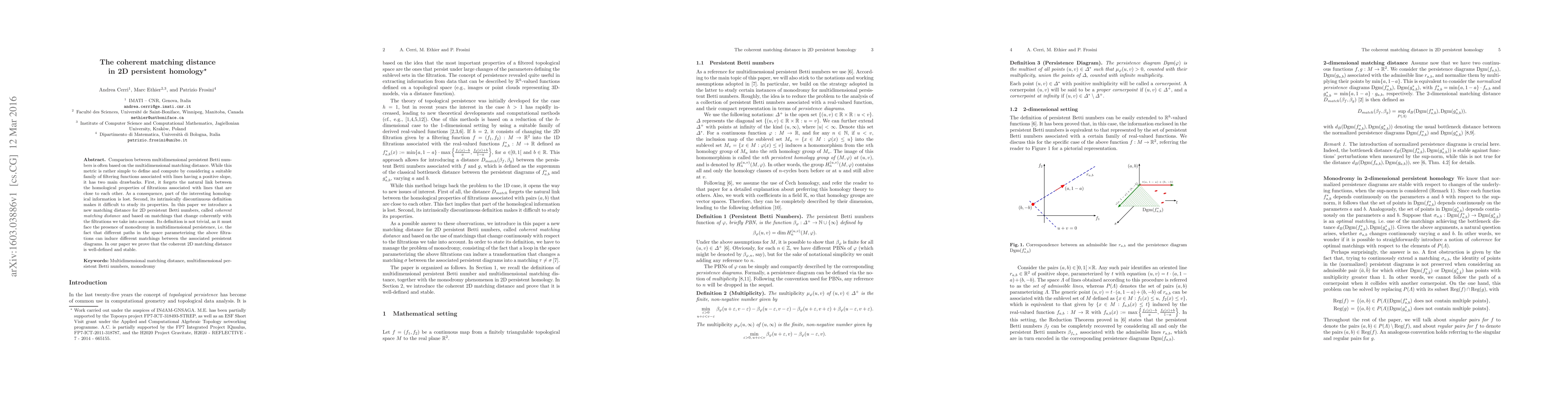Comparison between multidimensional persistent Betti numbers is often based on the multidimensional matching distance. While this metric is rather simple to define and compute by considering a suitable family of filtering functions associated with lines having a positive slope, it has two main drawbacks. First, it forgets the natural link between the homological properties of filtrations associated with lines that are close to each other. As a consequence, part of the interesting homological information is lost. Second, its intrinsically discontinuous definition makes it difficult to study its properties. In this paper we introduce a new matching distance for 2D persistent Betti numbers, called coherent matching distance and based on matchings that change coherently with the filtrations we take into account. Its definition is not trivial, as it must face the presence of monodromy in multidimensional persistence, i.e. the fact that different paths in the space parameterizing the above filtrations can induce different matchings between the associated persistent diagrams. In our paper we prove that the coherent 2D matching distance is well-defined and stable.