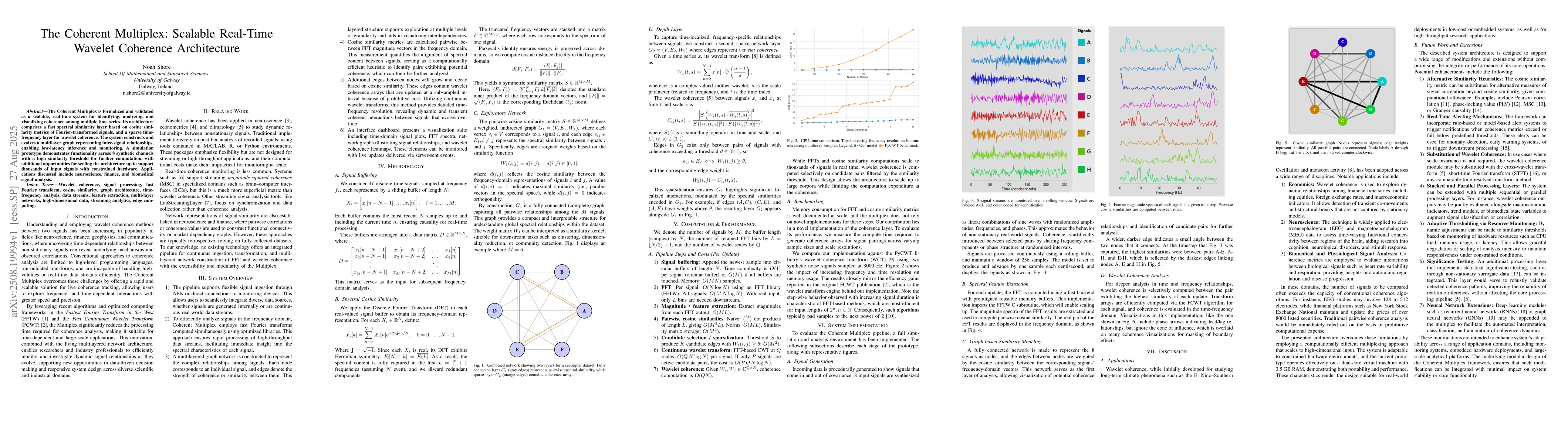 The Coherent Multiplex is formalized and validated as a scalable, real-time system for identifying, analyzing, and visualizing coherence among multiple time series. Its architecture comprises a fast spectral similarity layer based on cosine similarity metrics of Fourier-transformed signals, and a sparse time-frequency layer for wavelet coherence. The system constructs and evolves a multilayer graph representing inter-signal relationships, enabling low-latency inference and monitoring. A simulation prototype demonstrates functionality across 8 synthetic channels with a high similarity threshold for further computation, with additional opportunities for scaling the architecture up to support thousands of input signals with constrained hardware. Applications discussed include neuroscience, finance, and biomedical signal analysis.