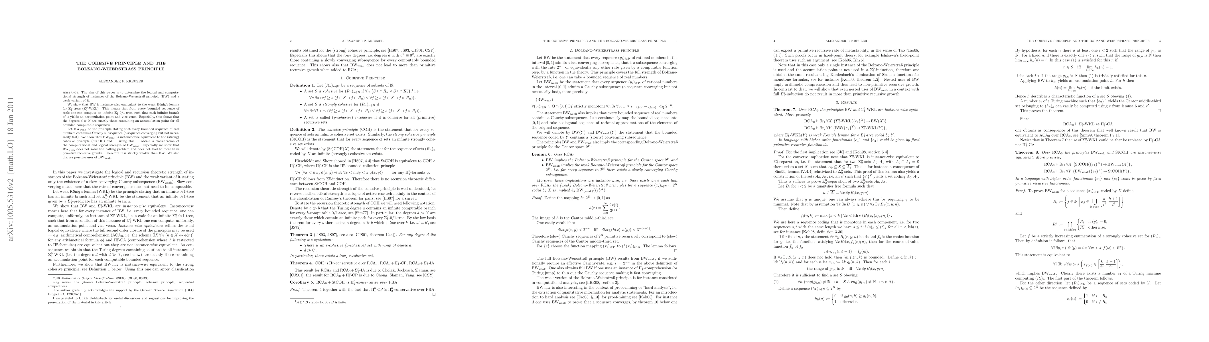 The aim of this paper is to determine the logical and computational strength of instances of the Bolzano-Weierstra{\ss} principle (BW) and a weak variant of it. We show that BW is instance-wise equivalent to the weak K\"onig's lemma for $\Sigma^0_1$-trees ($\Sigma^0_1$-WKL). This means that from every bounded sequence of reals one can compute an infinite $\Sigma^0_1$-0/1-tree, such that each infinite branch of it yields an accumulation point and vice versa. Especially, this shows that the degrees d >> 0' are exactly those containing an accumulation point for all bounded computable sequences. Let BW_weak be the principle stating that every bounded sequence of real numbers contains a Cauchy subsequence (a sequence converging but not necessarily fast). We show that BW_weak is instance-wise equivalent to the (strong) cohesive principle (StCOH) and - using this - obtain a classification of the computational and logical strength of BW_weak. Especially we show that BW_weak does not solve the halting problem and does not lead to more than primitive recursive growth. Therefore it is strictly weaker than BW. We also discuss possible uses of BW_weak.