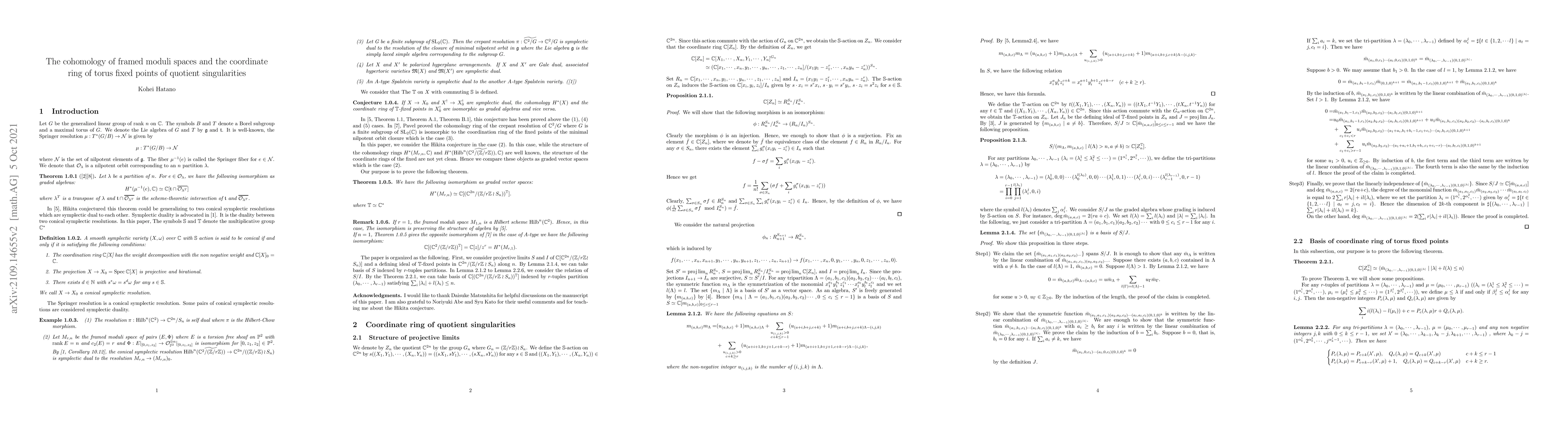 This research paper investigates the cohomology of framed moduli spaces over the projective plane and shows that the coordinate ring of $b{C}^*$-fixed points in a quotient singularity is isomorphic to its cohomology as graded vector spaces, addressing a long-standing conjecture.