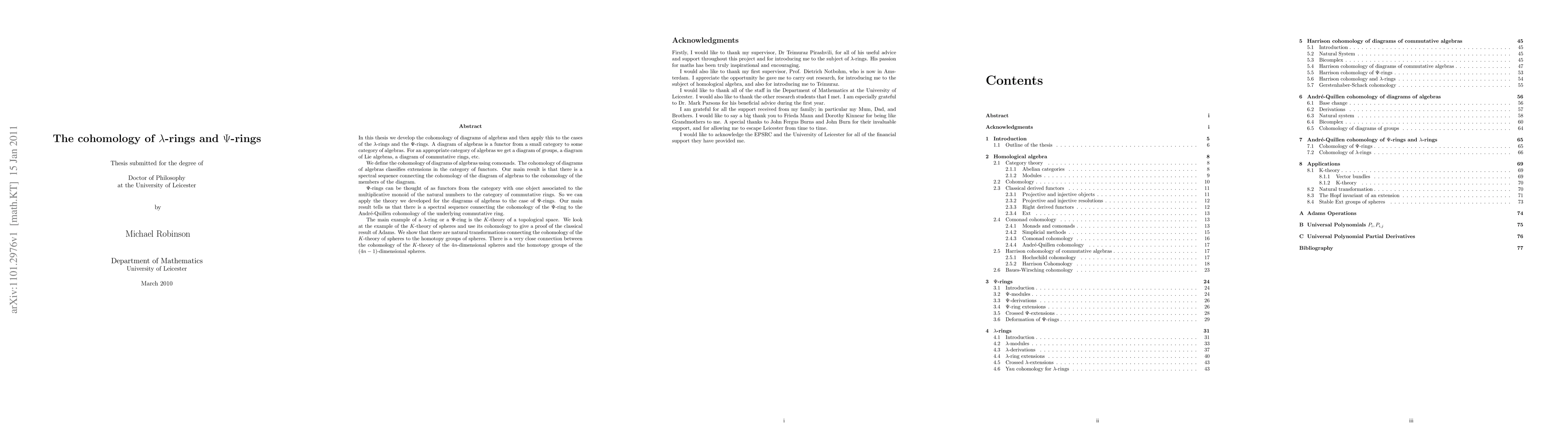 In this thesis we develop the cohomology of diagrams of algebras and then apply this to the cases of the $\lambda$-rings and the $\Psi$-rings. A diagram of algebras is a functor from a small category to some category of algebras. For an appropriate category of algebras we get a diagram of groups, a diagram of Lie algebras, a diagram of commutative rings, etc. We define the cohomology of diagrams of algebras using comonads. The cohomology of diagrams of algebras classifies extensions in the category of functors. Our main result is that there is a spectral sequence connecting the cohomology of the diagram of algebras to the cohomology of the members of the diagram. $\Psi$-rings can be thought of as functors from the category with one object associated to the multiplicative monoid of the natural numbers to the category of commutative rings. So we can apply the theory we developed for the diagrams of algebras to the case of $\Psi$-rings. Our main result tells us that there is a spectral sequence connecting the cohomology of the $\Psi$-ring to the Andr\'{e}-Quillen cohomology of the underlying commutative ring. The main example of a $\lambda$-ring or a $\Psi$-ring is the $K$-theory of a topological space. We look at the example of the $K$-theory of spheres and use its cohomology to give a proof of the classical result of Adams. We show that there are natural transformations connecting the cohomology of the $K$-theory of spheres to the homotopy groups of spheres. There is a very close connection between the cohomology of the $K$-theory of the $4n$-dimensional spheres and the homotopy groups of the $(4n-1)$-dimensional spheres.