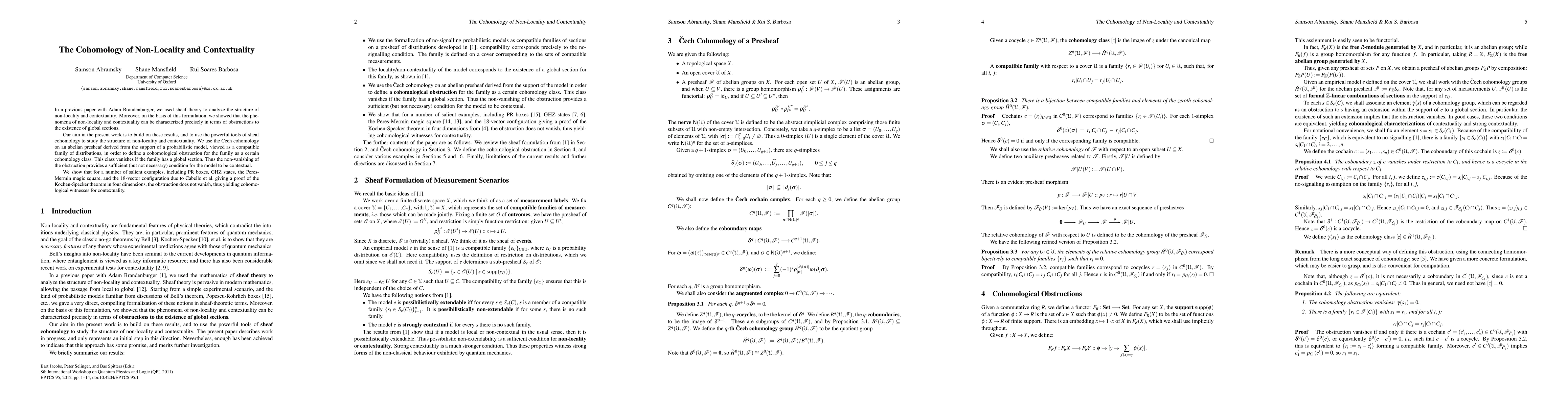 This paper builds on sheaf theory to use sheaf cohomology for analyzing non-locality and contextuality in quantum mechanics, demonstrating that non-vanishing cohomology classes serve as cohomological witnesses for contextuality in models like PR boxes and GHZ states.