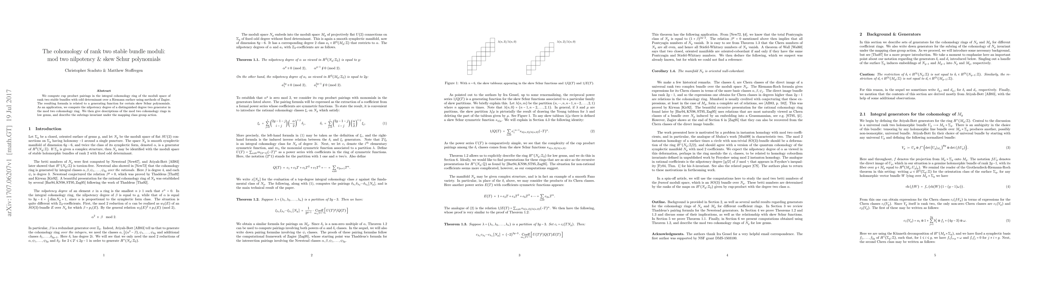 We compute cup product pairings in the integral cohomology ring of the moduli space of rank two stable bundles with odd determinant over a Riemann surface using methods of Zagier. The resulting formula is related to a generating function for certain skew Schur polynomials. As an application, we compute the nilpotency degree of a distinguished degree two generator in the mod two cohomology ring. We then give descriptions of the mod two cohomology rings in low genus, and describe the subrings invariant under the mapping class group action.