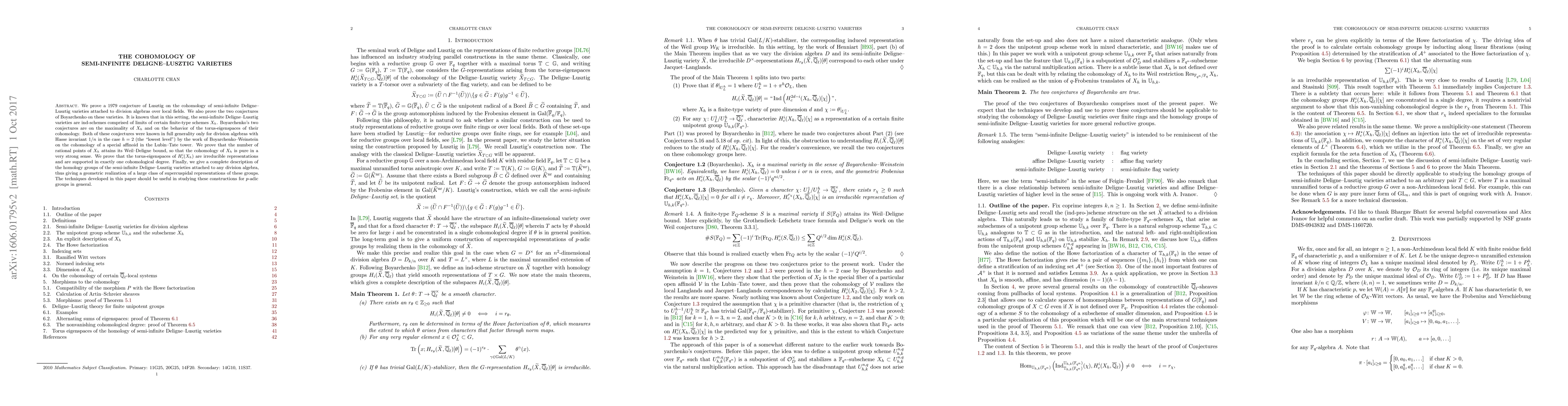 We prove a 1979 conjecture of Lusztig on the cohomology of semi-infinite Deligne--Lusztig varieties attached to division algebras over local fields. We also prove the two conjectures of Boyarchenko on these varieties. It is known that in this setting, the semi-infinite Deligne--Lusztig varieties are ind-schemes comprised of limits of certain finite-type schemes $X_h$. Boyarchenko's two conjectures are on the maximality of $X_h$ and on the behavior of the torus-eigenspaces of their cohomology. Both of these conjectures were known in full generality only for division algebras with Hasse invariant $1/n$ in the case $h = 2$ (the "lowest level") by the work of Boyarchenko--Weinstein on the cohomology of a special affinoid in the Lubin--Tate tower. We prove that the number of rational points of $X_h$ attains its Weil--Deligne bound, so that the cohomology of $X_h$ is pure in a very strong sense. We prove that the torus-eigenspaces of $H_c^i(X_h)$ are irreducible representations and are supported in exactly one cohomological degree. Finally, we give a complete description of the homology groups of the semi-infinite Deligne--Lusztig varieties attached to any division algebra, thus giving a geometric realization of the unramified supercuspidal representations of these groups. We expect that the techniques developed in this paper will be useful in studying these constructions for reductive groups over local fields in general.