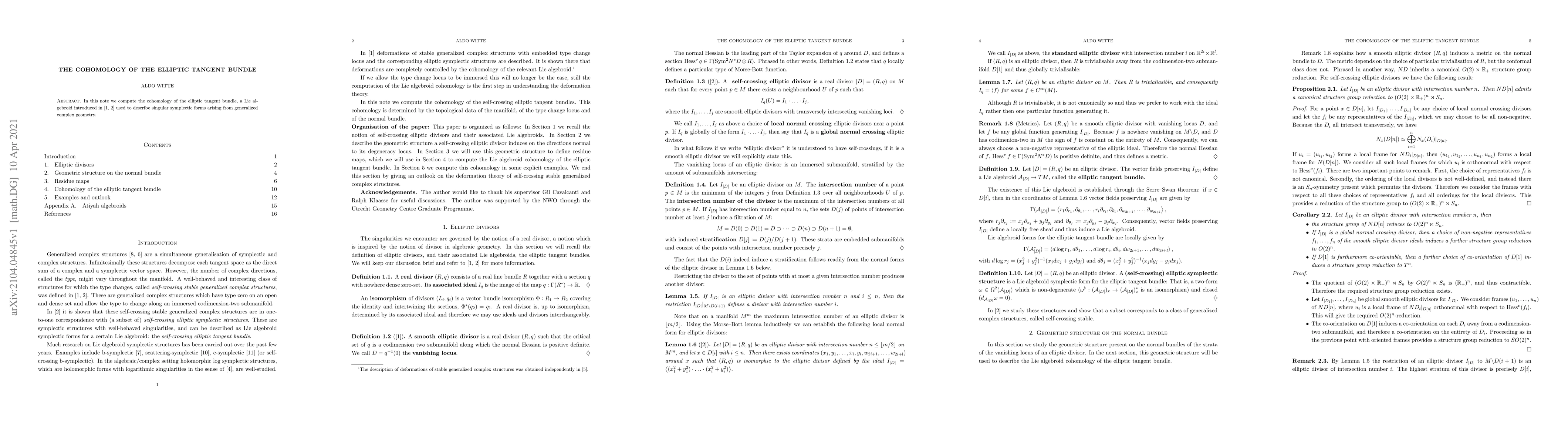 Summary: This paper computes the cohomology of the elliptic tangent bundle, a Lie algebroid relevant to generalized complex geometry, providing insights into singular symplectic forms. The results contribute to the understanding of the underlying structure in this mathematical framework.