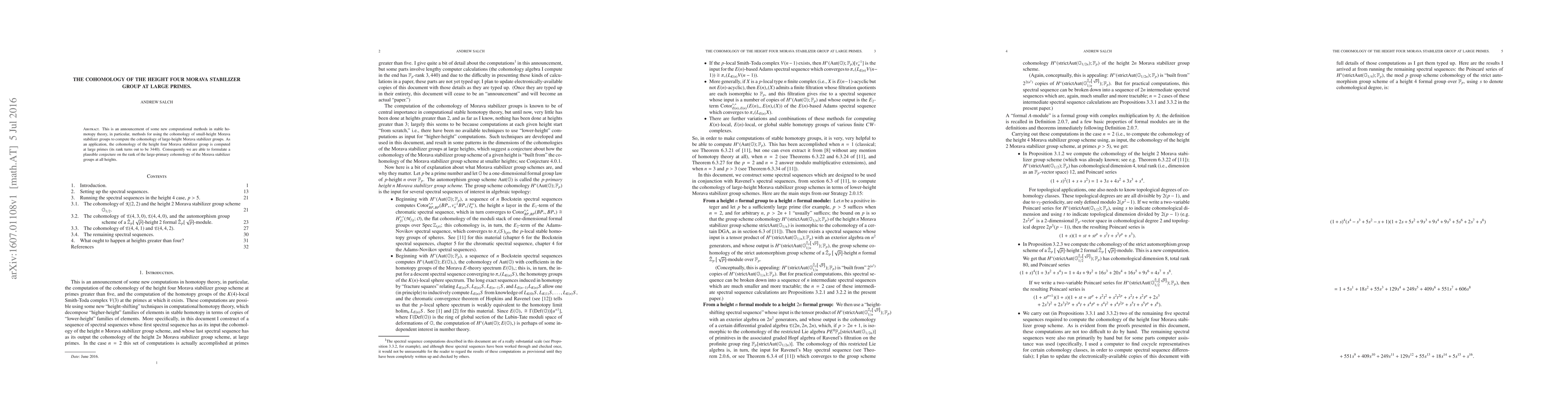 This is an announcement of some new computational methods in stable homotopy theory, in particular, methods for using the cohomology of small-height Morava stabilizer groups to compute the cohomology of large-height Morava stabilizer groups. As an application, the cohomology of the height four Morava stabilizer group is computed at large primes (its rank turns out to be $3440$). Consequently we are able to formulate a plausible conjecture on the rank of the large-primary cohomology of the Morava stabilizer groups at all heights.