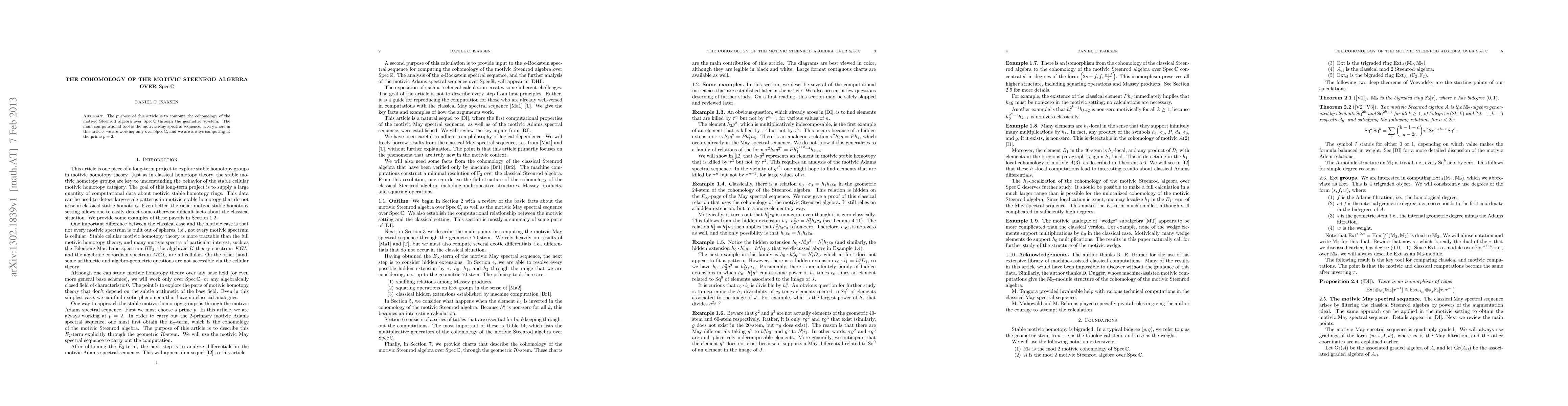 The purpose of this article is to compute the cohomology of the motivic Steenrod algebra over Spec C through the geometric 70-stem. The main computational tool is the motivic May spectral sequence. Everywhere in this article, we are working only over Spec C, and we are always computing at the prime p = 2.
