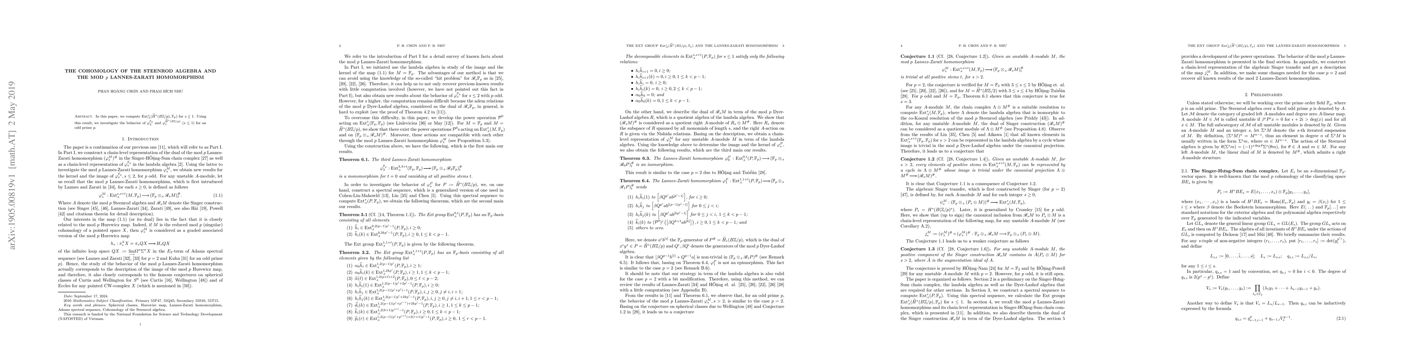 In this paper, we compute ${\rm Ext}_{A}^{s}(\widetilde{H}^*(B\mathbb{Z}/p),\mathbb{F}_p)$ for $s\leq 1$. Using this result, we investigate the behavior of $\varphi_3^{\mathbb{F}_p}$ and $\varphi_s^{\widetilde{H}^*(B\mathbb{Z}/p)}\ (s\leq1)$ for an odd prime $p$.