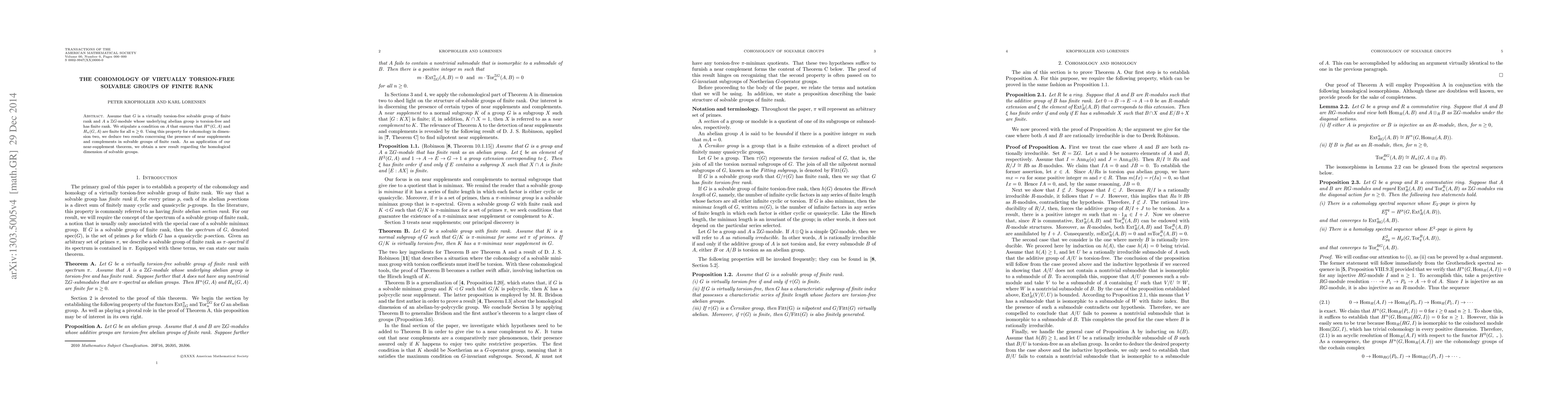 This paper studies the cohomology of virtually torsion-free solvable groups of finite rank under specific conditions on modules, proving that certain cohomology groups are finite and deriving results on near supplements and complements in these groups, ultimately leading to new insights on their homological dimension.