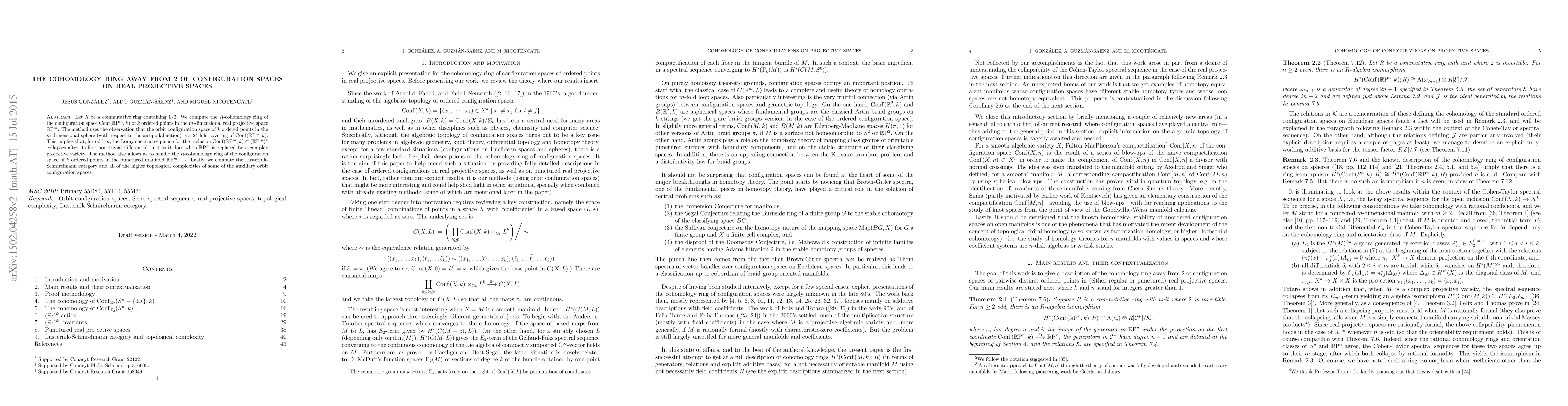 This paper computes the R-cohomology ring of configuration spaces on real projective spaces for a commutative ring containing 1/2. The method leverages a 2^k-fold covering of configuration spaces in spheres, leading to a collapsed Leray spectral sequence for odd dimensions.