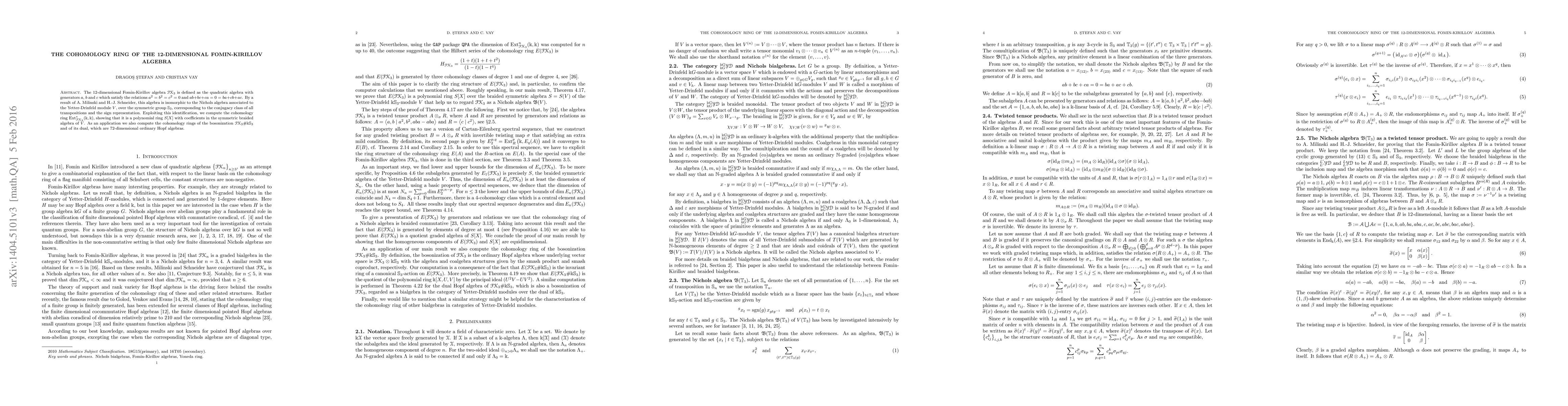 The $12$-dimensional Fomin-Kirillov algebra $FK_3$ is defined as the quadratic algebra with generators $a$, $b$ and $c$ which satisfy the relations $a^2=b^2=c^2=0$ and $ab+bc+ca=0=ba+cb+ac$. By a result of A. Milinski and H.-J. Schneider, this algebra is isomorphic to the Nichols algebra associated to the Yetter-Drinfeld module $V$, over the symmetric group $\mathbb{S}_3$, corresponding to the conjugacy class of all transpositions and the sign representation. Exploiting this identification, we compute the cohomology ring $Ext_{FK_3}^*(\Bbbk,\Bbbk)$, showing that it is a polynomial ring $S[X]$ with coefficients in the symmetric braided algebra of $V$. As an application we also compute the cohomology rings of the bosonization $FK_3\#\Bbbk\mathbb{S}_3$ and of its dual, which are $72$-dimensional ordinary Hopf algebras.