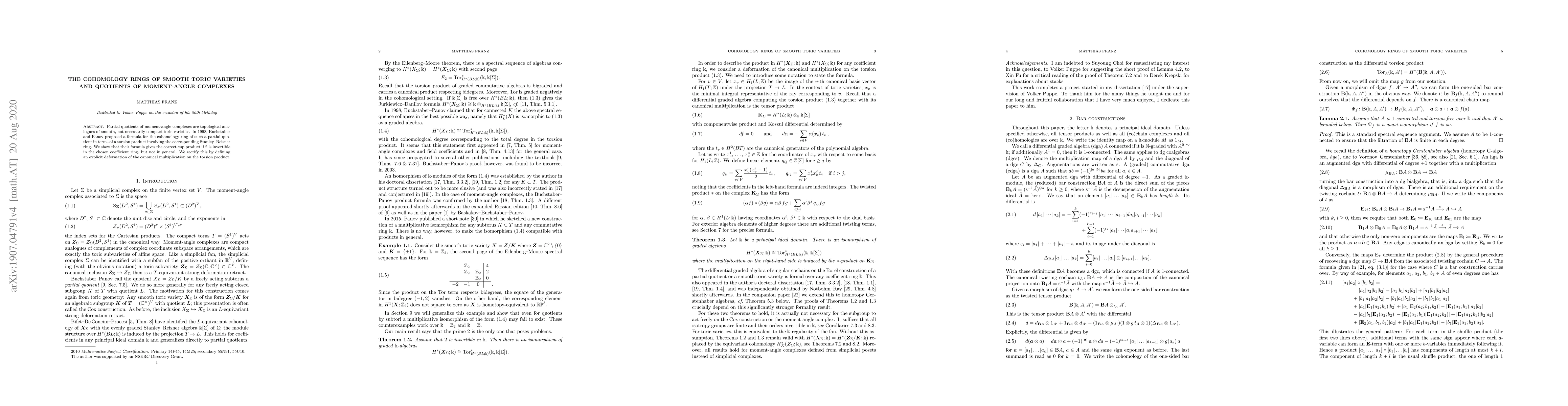 Partial quotients of moment-angle complexes are topological analogues of smooth, not necessarily compact toric varieties. In 1998, Buchstaber and Panov proposed a formula for the cohomology ring of such a partial quotient in terms of a torsion product involving the corresponding Stanley-Reisner ring. We show that their formula gives the correct cup product if 2 is invertible in the chosen coefficient ring, but not in general. We rectify this by defining an explicit deformation of the canonical multiplication on the torsion product.