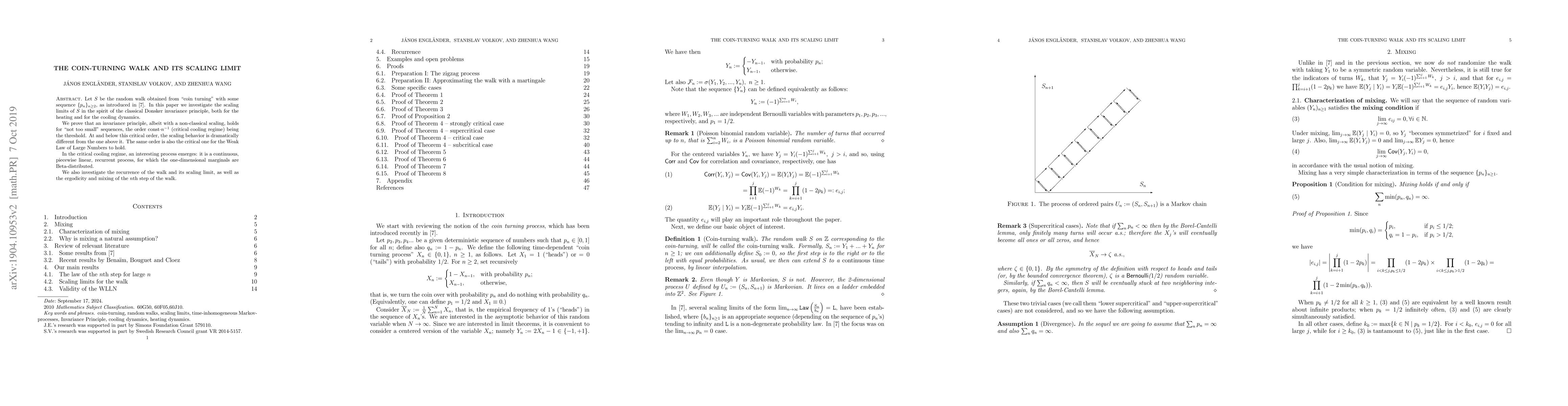 Let $S$ be the random walk obtained from "coin turning" with some sequence $\{p_n\}_{n\ge 1}$, as introduced in [6]. In this paper we investigate the scaling limits of $S$ in the spirit of the classical Donsker invariance principle, both for the heating and for the cooling dynamics. We prove that an invariance principle, albeit with a non-classical scaling, holds for "not too small" sequences, the order const$\cdot n^{-1}$ (critical cooling regime) being the threshold. At and below this critical order, the scaling behavior is dramatically different from the one above it. The same order is also the critical one for the Weak Law of Large Numbers to hold. In the critical cooling regime, an interesting process emerges: it is a continuous, piecewise linear, recurrent process, for which the one-dimensional marginals are Beta-distributed. We also investigate the recurrence of the walk and its scaling limit, as well as the ergodicity and mixing of the $n$th step of the walk.
