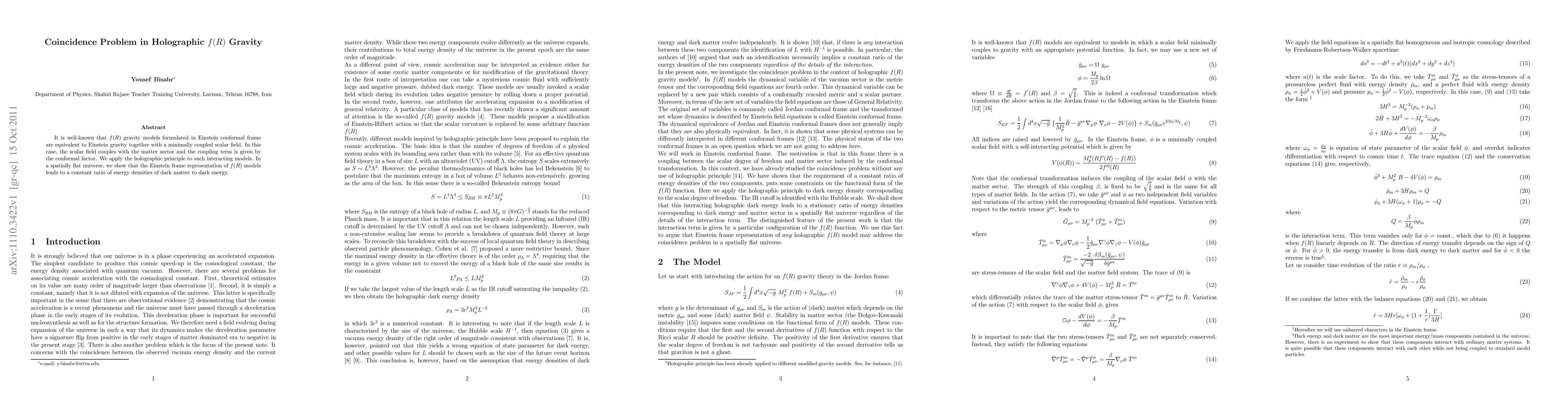 This paper explores the coincidence problem in holographic $f(R)$ gravity, demonstrating that the Einstein frame representation of $f(R)$ models results in a constant ratio of dark matter to dark energy densities, applying the holographic principle to interacting scalar fields.