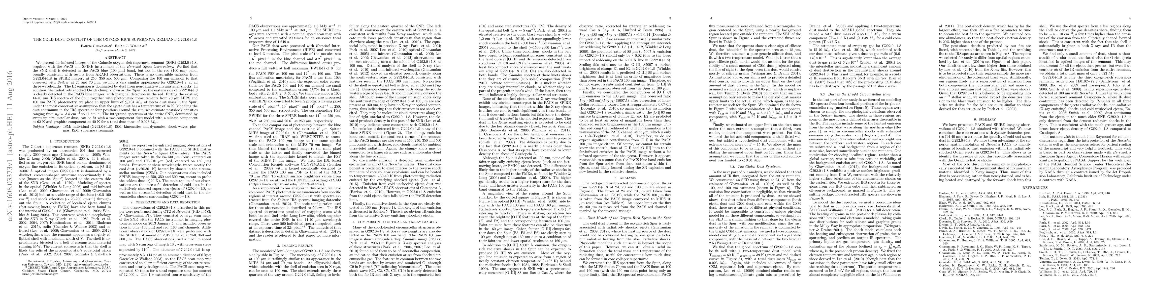 This paper investigates the cold dust content in the oxygen-rich supernova remnant G292.0+1.8 using Herschel Space Observatory data, finding minimal dust emission and estimating a total dust mass of 0.023 solar masses, dominated by swept-up circumstellar dust. The 'Spur' feature shows an upper limit of ejecta dust mass of <~ 0.04 solar masses.