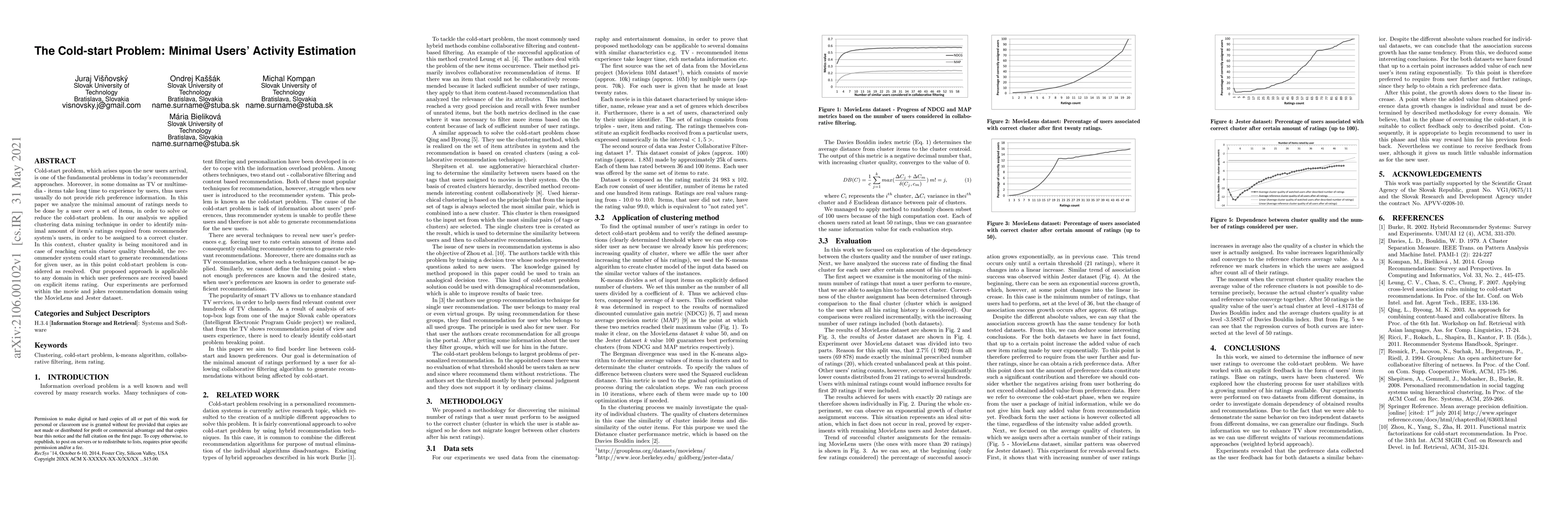 Cold-start problem, which arises upon the new users arrival, is one of the fundamental problems in today's recommender approaches. Moreover, in some domains as TV or multime-dia-items take long time to experience by users, thus users usually do not provide rich preference information. In this paper we analyze the minimal amount of ratings needs to be done by a user over a set of items, in order to solve or reduce the cold-start problem. In our analysis we applied clustering data mining technique in order to identify minimal amount of item's ratings required from recommender system's users, in order to be assigned to a correct cluster. In this context, cluster quality is being monitored and in case of reaching certain cluster quality threshold, the rec-ommender system could start to generate recommendations for given user, as in this point cold-start problem is considered as resolved. Our proposed approach is applicable to any domain in which user preferences are received based on explicit items rating. Our experiments are performed within the movie and jokes recommendation domain using the MovieLens and Jester dataset.
