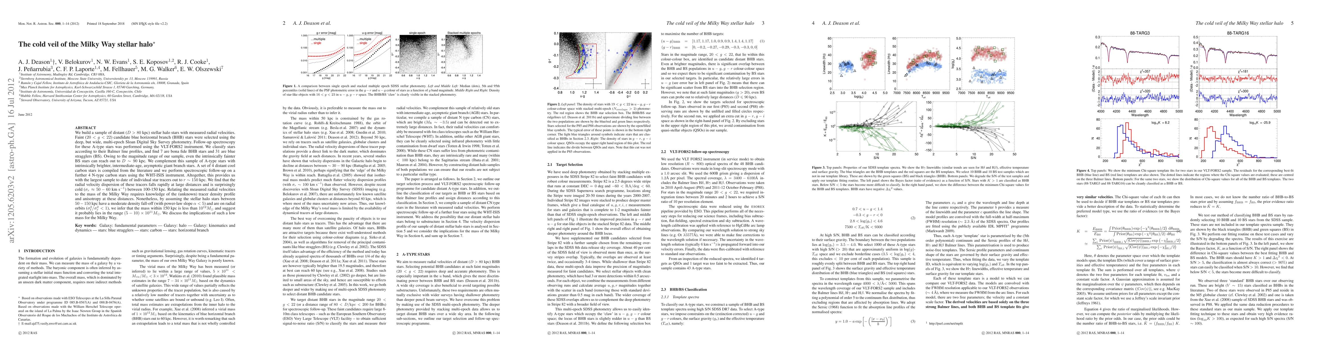 We build a sample of distant (D > 80 kpc) stellar halo stars with measured radial velocities. Faint ($20 < g <22$) candidate blue horizontal branch (BHB) stars were selected using the deep, but wide, multi-epoch Sloan Digital Sky Survey photometry. Follow-up spectroscopy for these A-type stars was performed using the VLT-FORS2 instrument. We classify stars according to their Balmer line profiles, and find 7 are bona fide BHB stars and 31 are blue stragglers (BS). Owing to the magnitude range of our sample, even the intrinsically fainter BS stars can reach out to D ~ 90 kpc. We complement this sample of A-type stars with intrinsically brighter, intermediate-age, asymptotic giant branch stars. A set of 4 distant cool carbon stars is compiled from the literature and we perform spectroscopic follow-up on a further 4 N-type carbon stars using the WHT-ISIS instrument. Altogether, this provides us with the largest sample to date of individual star tracers out to r ~ 150 kpc. We find that the radial velocity dispersion of these tracers falls rapidly at large distances and is surprisingly cold (sigma_r ~ 50-60 km/s) between 100-150 kpc. Relating the measured radial velocities to the mass of the Milky Way requires knowledge of the (unknown) tracer density profile and anisotropy at these distances. Nonetheless, by assuming the stellar halo stars between 50-150 kpc have a moderate density fall-off (with power-law slope alpha < 5) and are on radial orbits (sigma^2_t/sigma^2_r < 1), we infer that the mass within 150 kpc is less than 10^12 M_solar and suggest it probably lies in the range (5-10) x 10^11 M_solar. We discuss the implications of such a low mass for the Milky Way.