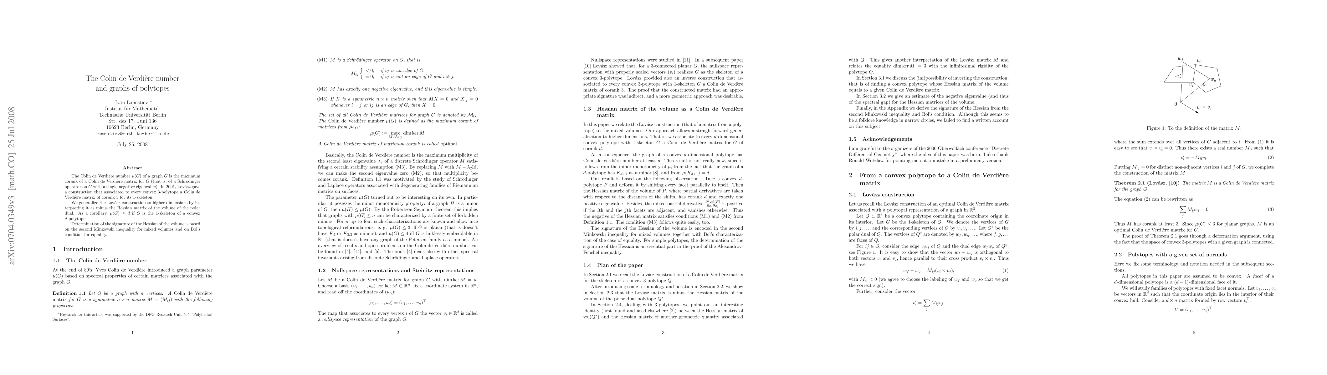 This paper generalizes the construction by Lovász that links the Colin de Verdière number of a graph to the Hessian matrix of the volume of its associated convex polytope, establishing that $\mu(G) \ge d$ for graphs derived from the 1-skeleton of convex $d$-polytopes. The method utilizes the second Minkowski inequality and Bol's condition for equality.