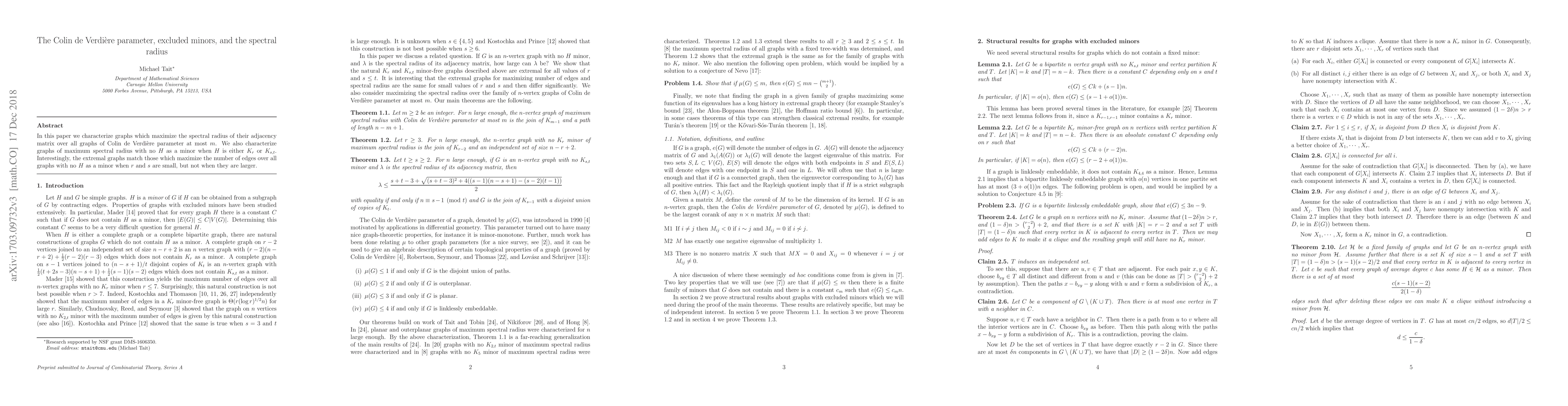 This paper characterizes graphs that maximize the spectral radius of their adjacency matrix under constraints on the Colin de Verdière parameter and excluded minors. It finds that extremal graphs for these conditions often match those with maximum edge counts, except when the excluded minor is large.