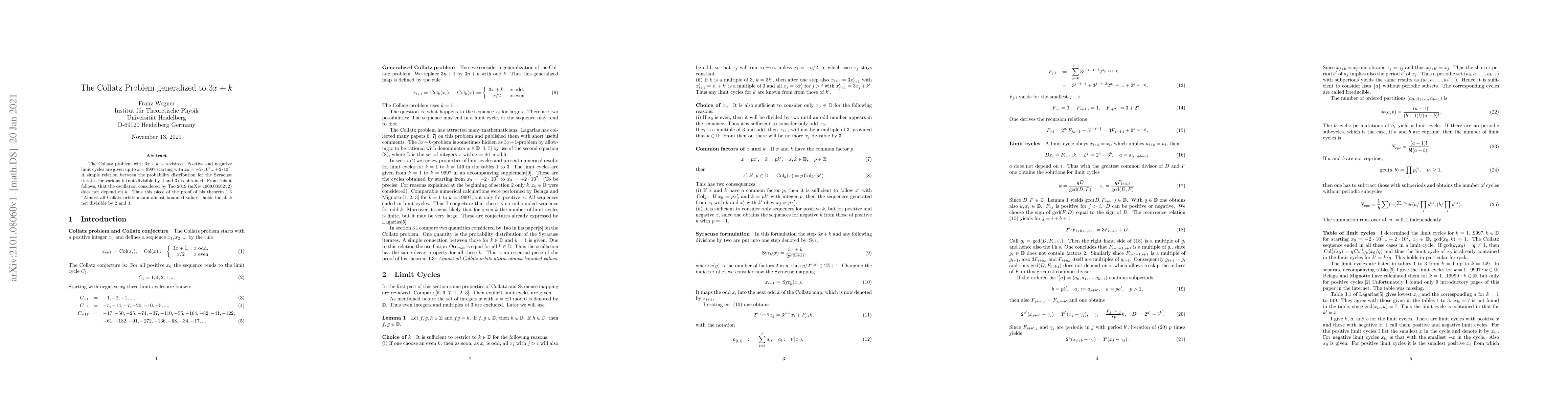 The Collatz problem with $3x+k$ is revisited. Positive and negative limit cycles are given up to k=9997 starting with $x_0=-2\cdot10^7...+2\cdot10^7$. A simple relation between the probability distribution for the Syracuse iterates for various k (not divisible by 2 and 3) is obtained. From this it follows that the oscillation considered by Tao 2019 ( arXiv:1909.03562v2 ) does not depend on k. Thus this piece of the proof of his theorem 1.3 "Almost all Collatz orbits attain almost bounded values" holds for all k not divisible by 2 and 3.