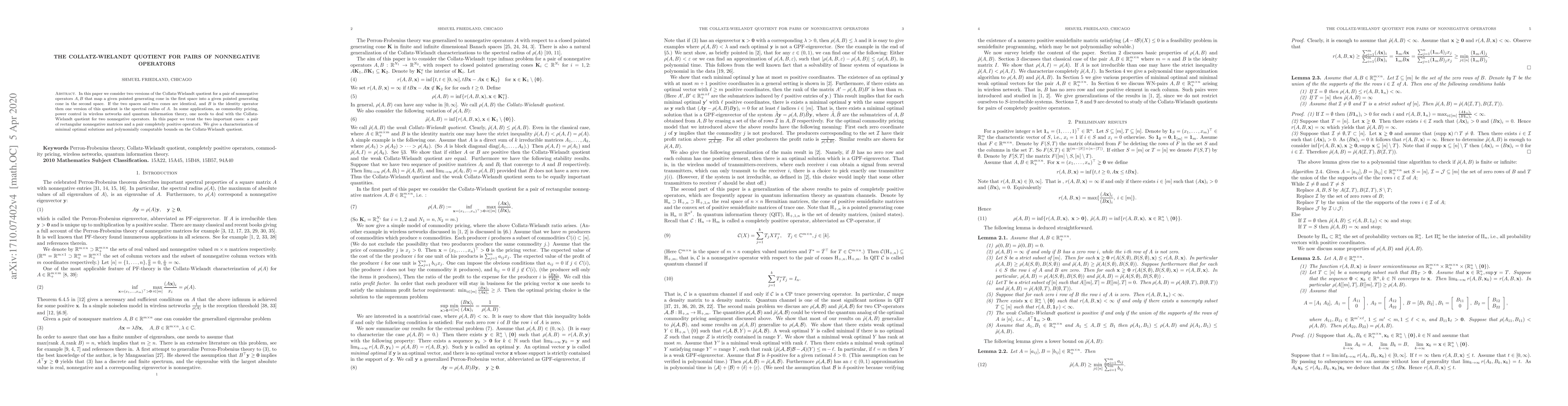 This paper explores two versions of the Collatz-Wielandt quotient for pairs of nonnegative operators, focusing on rectangular nonnegative matrices and completely positive operators. It characterizes minimal optimal solutions and provides polynomially computable bounds for these quotients, which are crucial in applications like commodity pricing and power control.