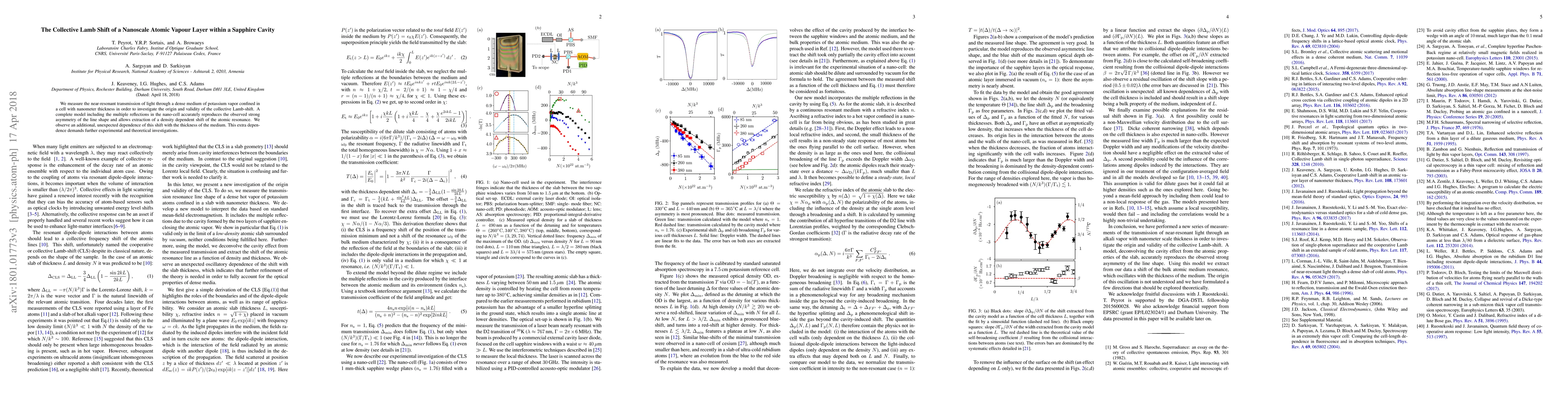 The research investigates the collective Lamb shift in a nanoscale potassium vapor layer confined within a sapphire cavity by measuring near-resonant light transmission. A model accounting for multiple reflections in the nano-cell accurately reproduces the observed asymmetric line shape, allowing extraction of a density-dependent atomic resonance shift.