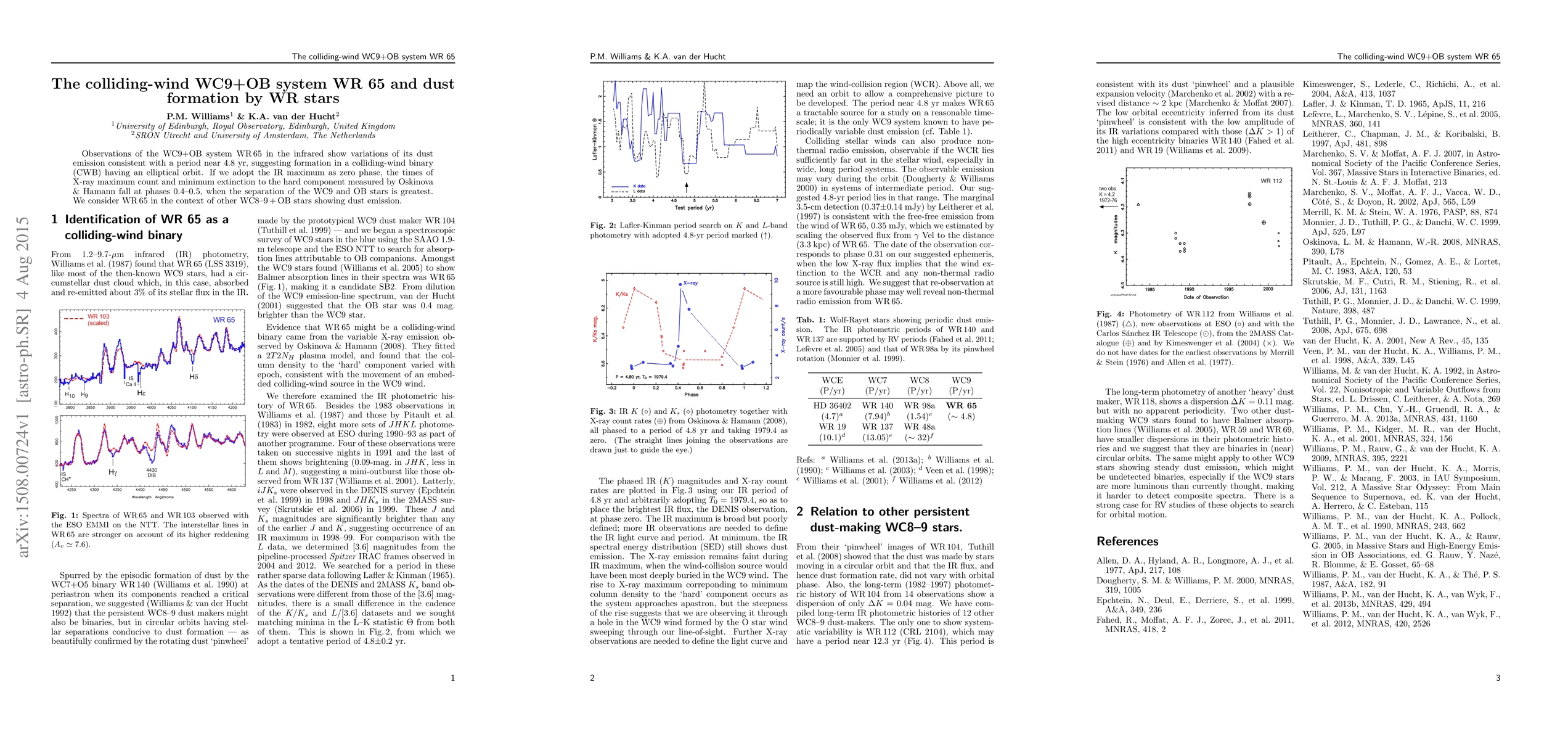 Observations of the WC9+OB system WR 65 in the infrared show variations of its dust emission consistent with a period near 4.8~yr, suggesting formation in a colliding-wind binary (CWB) having an elliptical orbit. If we adopt the IR maximum as zero phase, the times of X-ray maximum count and minimum extinction to the hard component measured by Oskinova & Hamann fall at phases 0.4--0.5, when the separation of the WC9 and OB stars is greatest. We consider WR 65 in the context of other WC8-9+OB stars showing dust emission.