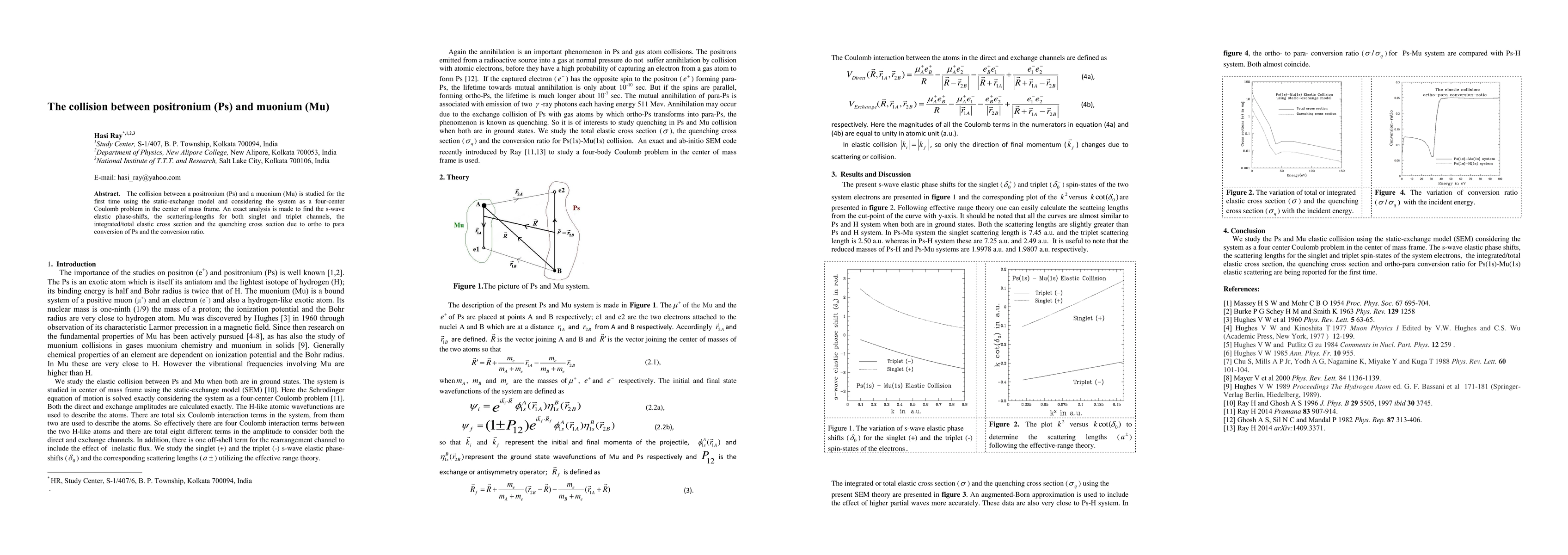 This study investigates the first collision between positronium (Ps) and muonium (Mu) using the static-exchange model, analyzing s-wave elastic phase-shifts, scattering-lengths, and cross sections, including quenching effects due to Ps ortho to para conversion.