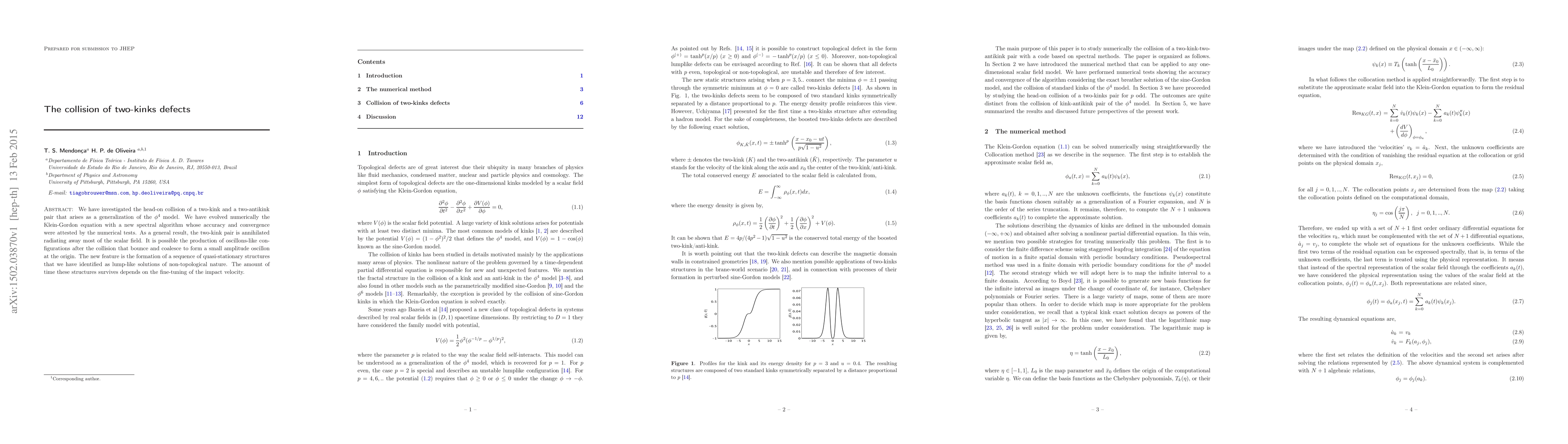 Researchers studied the collision of two-kink defects in a model that generalizes the $ ho^4$ theory, finding that they annihilate and radiate energy, potentially creating oscillons or lump-like structures that survive for varying lengths of time depending on impact velocity.