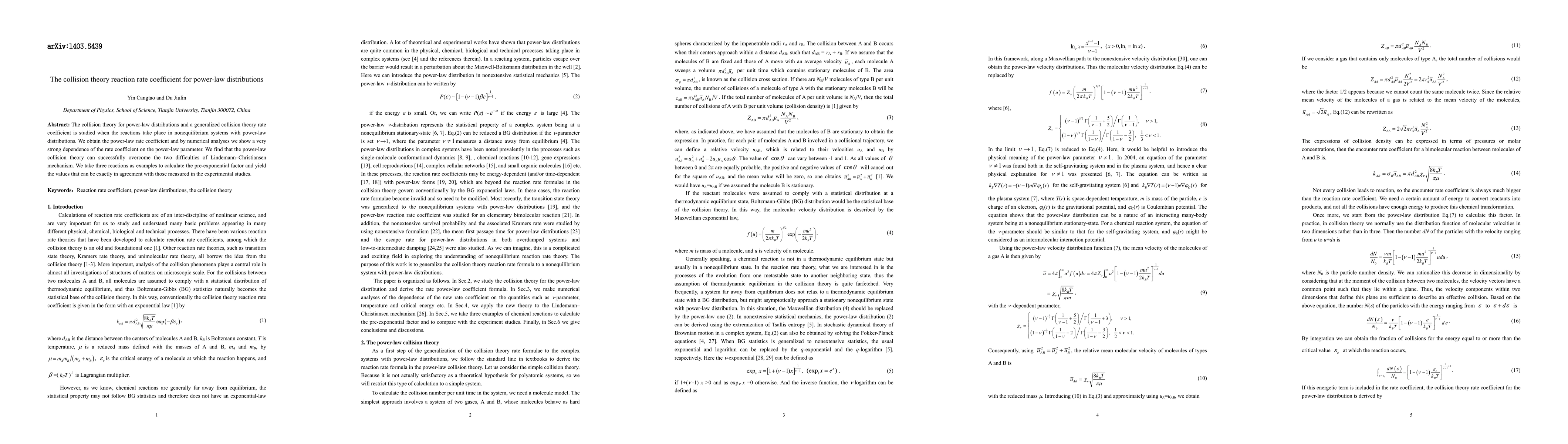 This paper investigates the collision theory for power-law distributions in nonequilibrium systems, deriving a generalized rate coefficient that shows a strong dependence on the power-law parameter. The study successfully addresses the limitations of the Lindemann-Christiansen mechanism and validates the model through numerical analysis and experimental data.