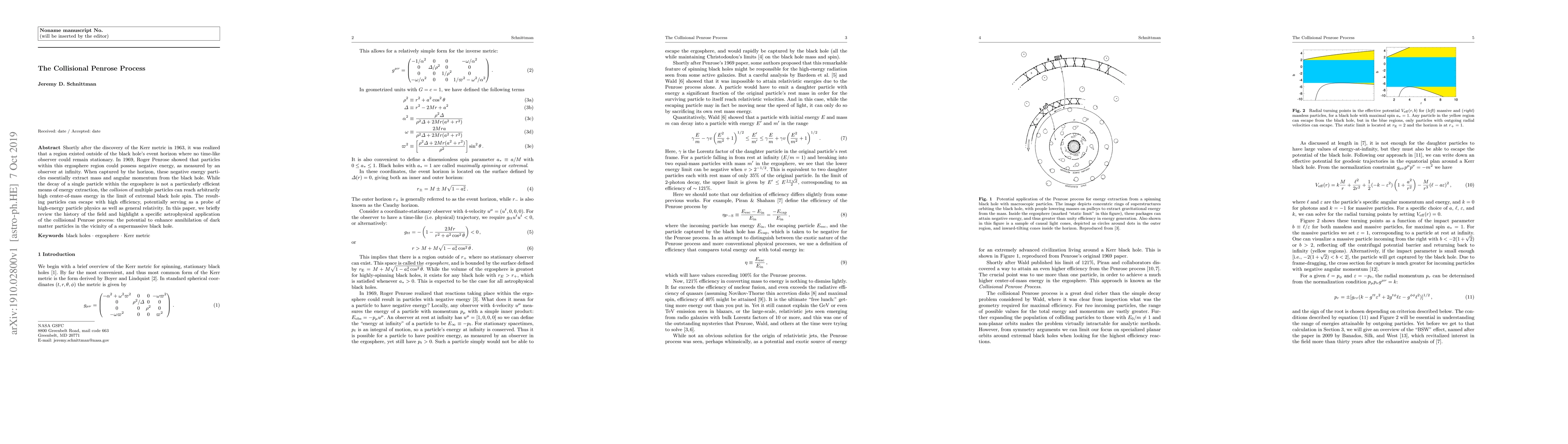 This paper reviews the collisional Penrose process, a mechanism where particles in a black hole's ergosphere can extract energy by colliding, potentially enhancing dark matter annihilation near supermassive black holes. The process highlights high-energy particle physics and general relativity applications.
