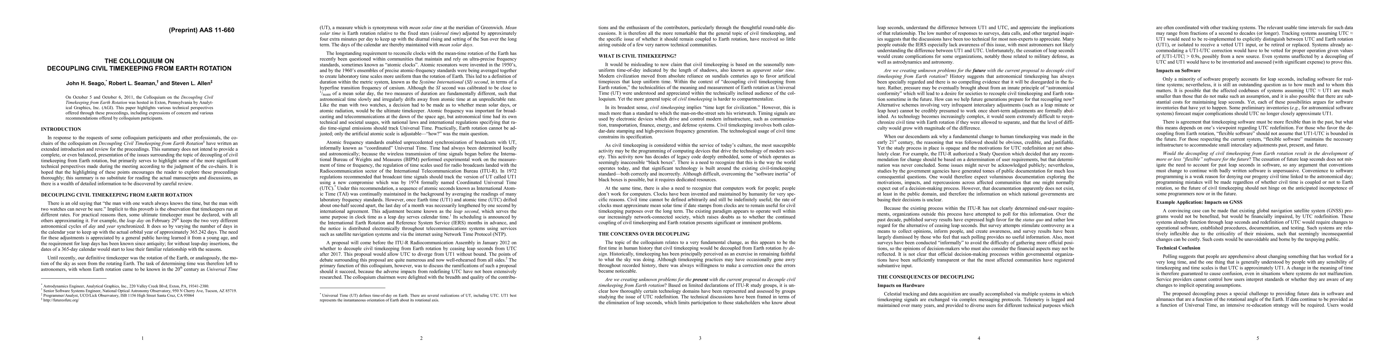 On October 5 and October 6, 2011, the Colloquium on the Decoupling Civil Timekeeping from Earth Rotation was hosted in Exton, Pennsylvania by Analytical Graphics, Inc. (AGI). This paper highlights various technical perspectives offered through these proceedings, including expressions of concern and various recommendations offered by colloquium participants.