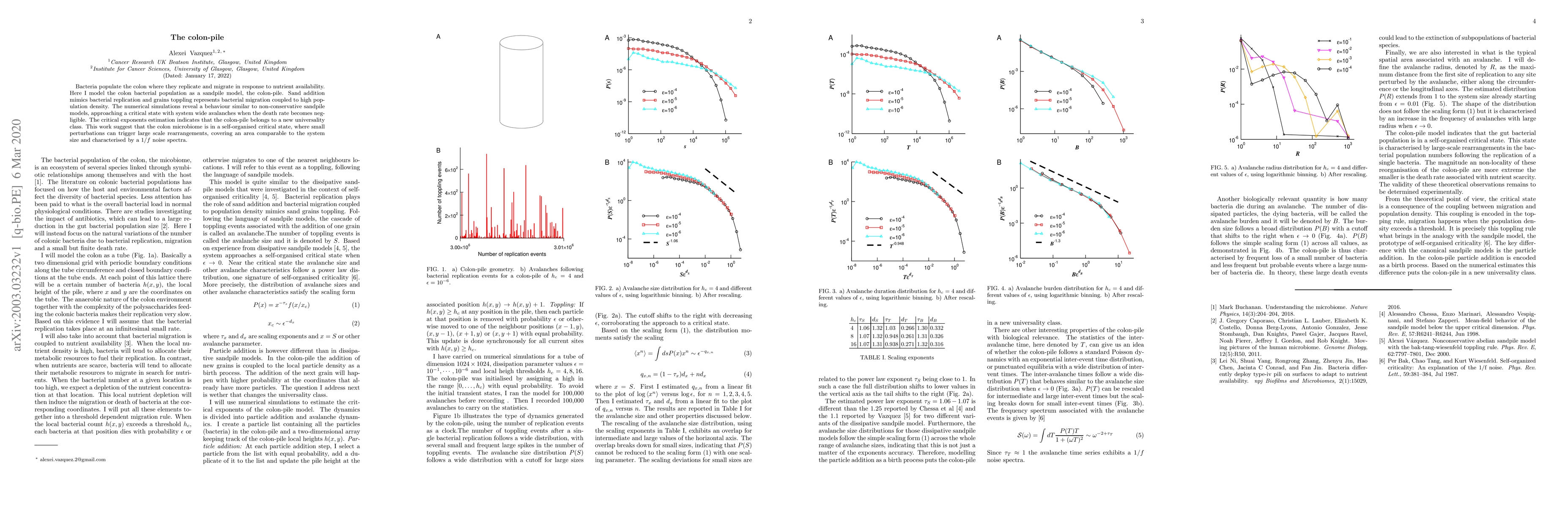 Bacteria populate the colon where they replicate and migrate in response to nutrient availability. Here I model the colon bacterial population as a sandpile model, the colon-pile. Sand addition mimics bacterial replication and grains toppling represents bacterial migration coupled to high population density. The numerical simulations reveal a behaviour similar to non-conservative sandpile models, approaching a critical state with system wide avalanches when the death rate becomes negligible. The critical exponents estimation indicates that the colon-pile belongs to a new universality class. This work suggest that the colon microbiome is in a self-organised critical state, where small perturbations can trigger large scale rearrangements, covering an area comparable to the system size and characterised by a 1/f noise spectra