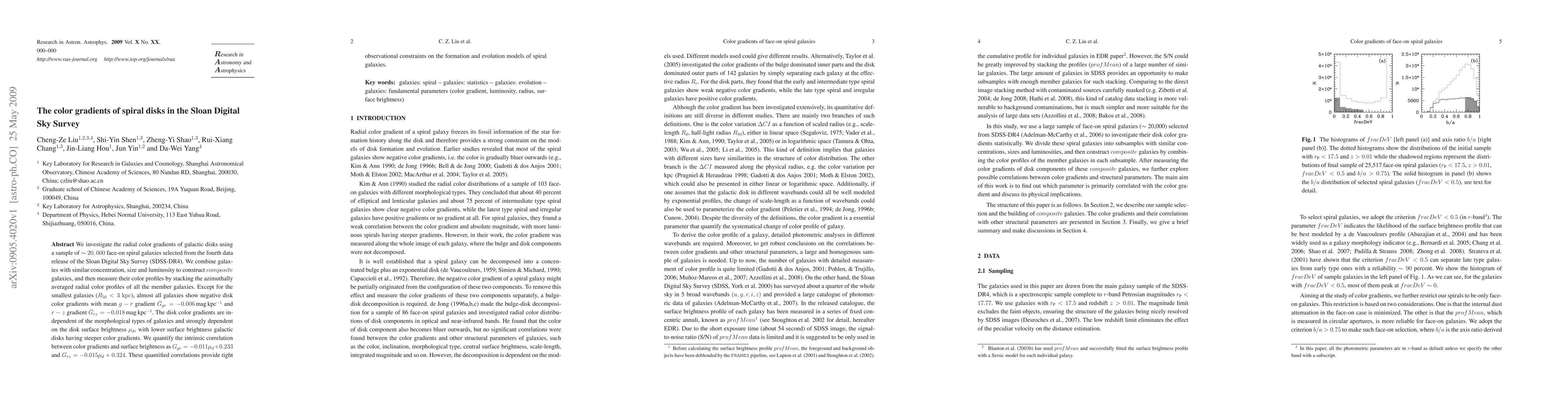 This study examines the radial color gradients of spiral galaxies from SDSS-DR4, finding that most galaxies exhibit negative gradients independent of morphology but strongly correlated with disk surface brightness. The gradients are quantified, providing insights into spiral galaxy formation and evolution.