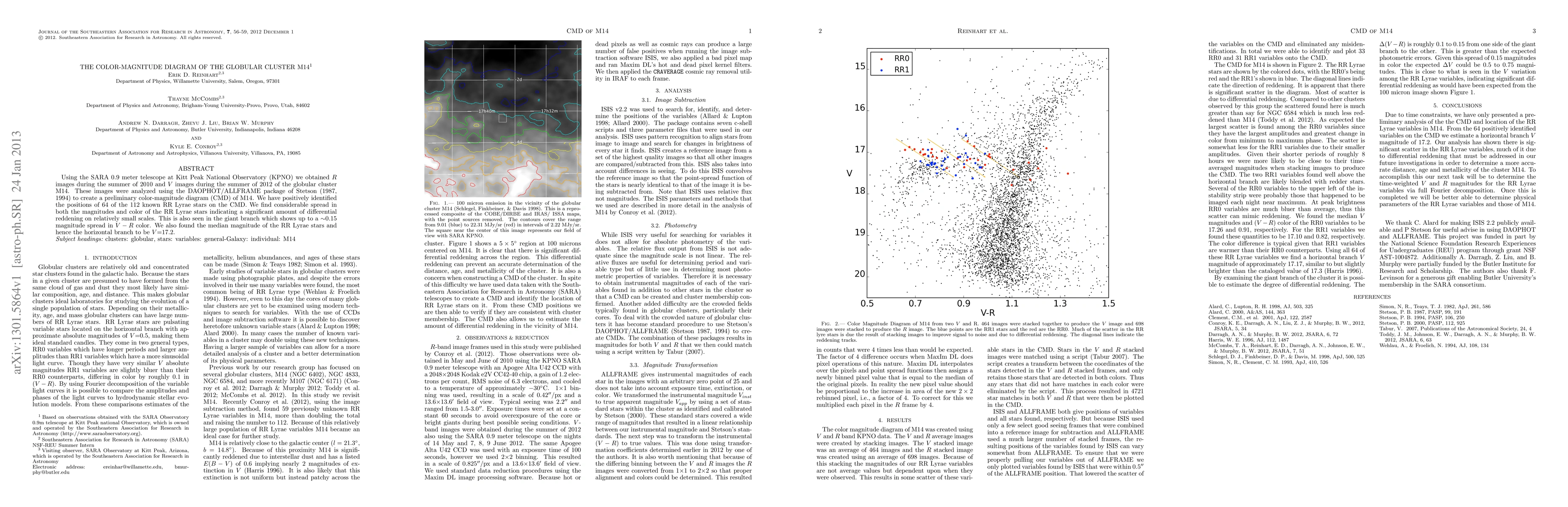 This study utilized the SARA telescope to capture R and V images of the globular cluster M14, creating a color-magnitude diagram that shows significant differential reddening and a spread in RR Lyrae stars' magnitudes and colors, indicating complex interstellar extinction. The horizontal branch's median magnitude was determined to be V=17.2.