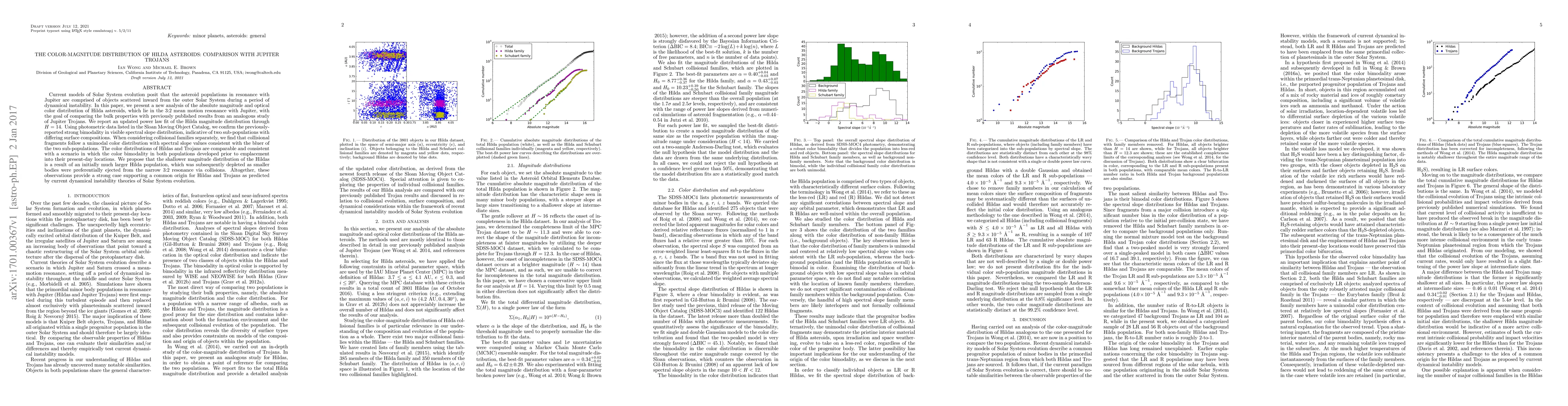 This paper analyzes the absolute magnitude and optical color distribution of Hilda asteroids, finding a strong bimodality in spectral slope indicative of two sub-populations. It compares these properties with Jupiter Trojans, suggesting a common origin for both populations due to comparable color distributions and supporting theories of Solar System evolution through dynamical instability.