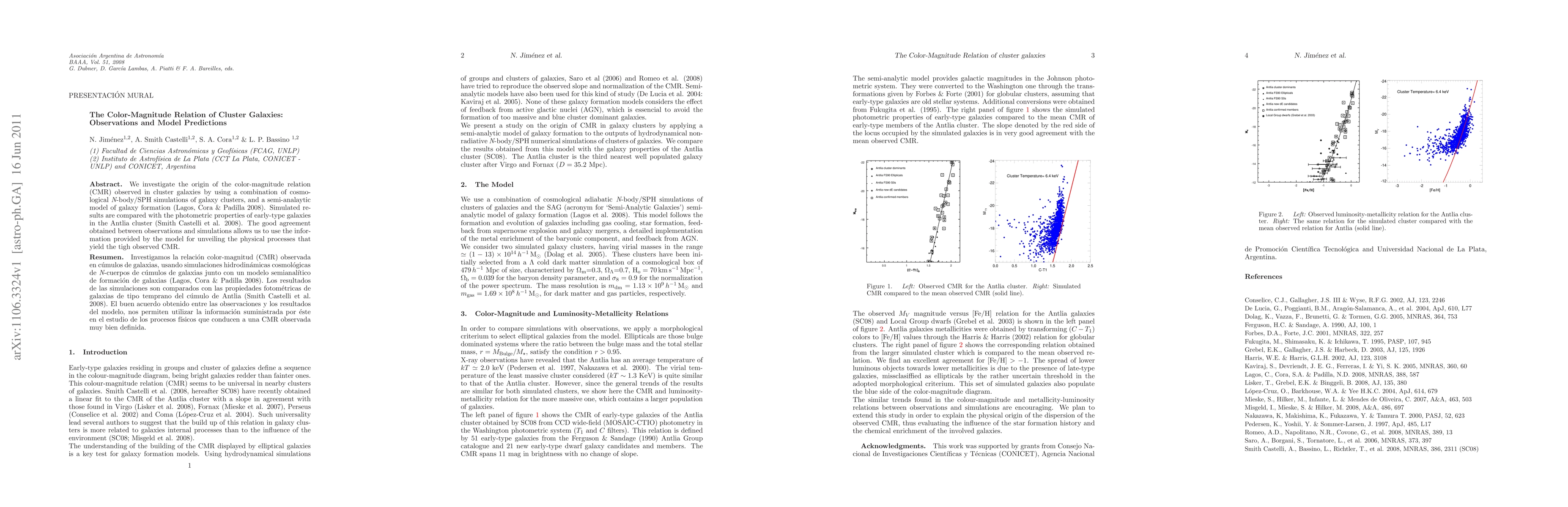 We investigate the origin of the color-magnitude relation (CMR) observed in cluster galaxies by using a combination of cosmological N-body/SPH simulations of galaxy clusters, and a semi-analaytic model of galaxy formation (Lagos, Cora & Padilla 2008). Simulated results are compared with the photometric properties of early-type galaxies in the Antlia cluster (Smith Castelli et al. 2008). The good agreement obtained between observations and simulations allows us to use the information provided by the model for unveiling the physical processes that yield the tigh observed CMR.
