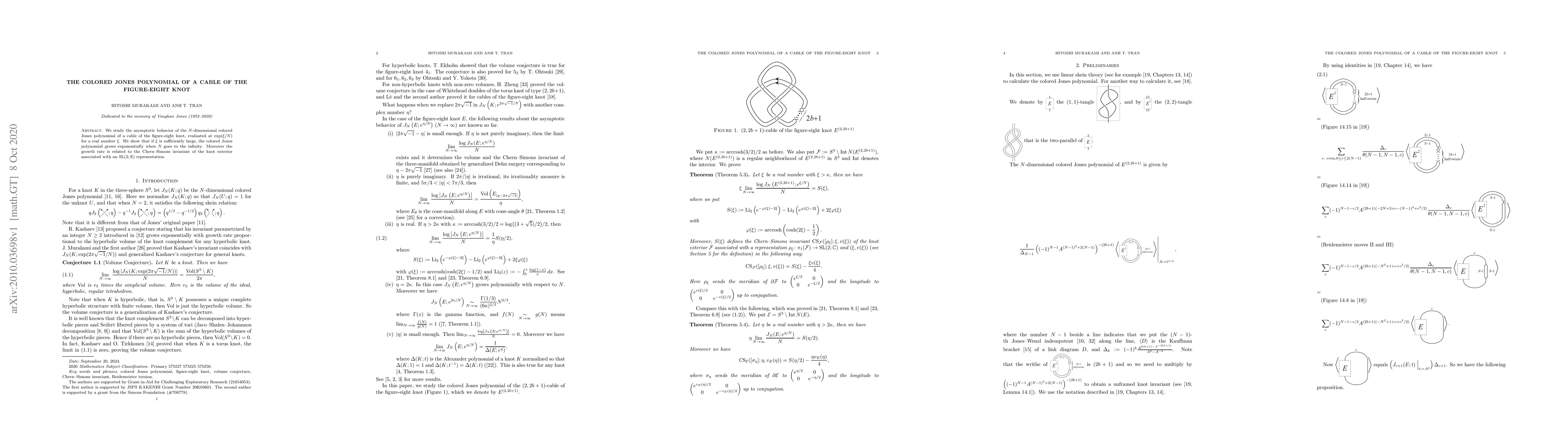 This paper examines the asymptotic behavior of the colored Jones polynomial for a cable of the figure-eight knot, showing exponential growth as $N$ tends to infinity when $\xi$ is sufficiently large. The growth rate is linked to the Chern-Simons invariant of the knot exterior under an $\mathrm{SL}(2;\mathbb{R})$ representation.
