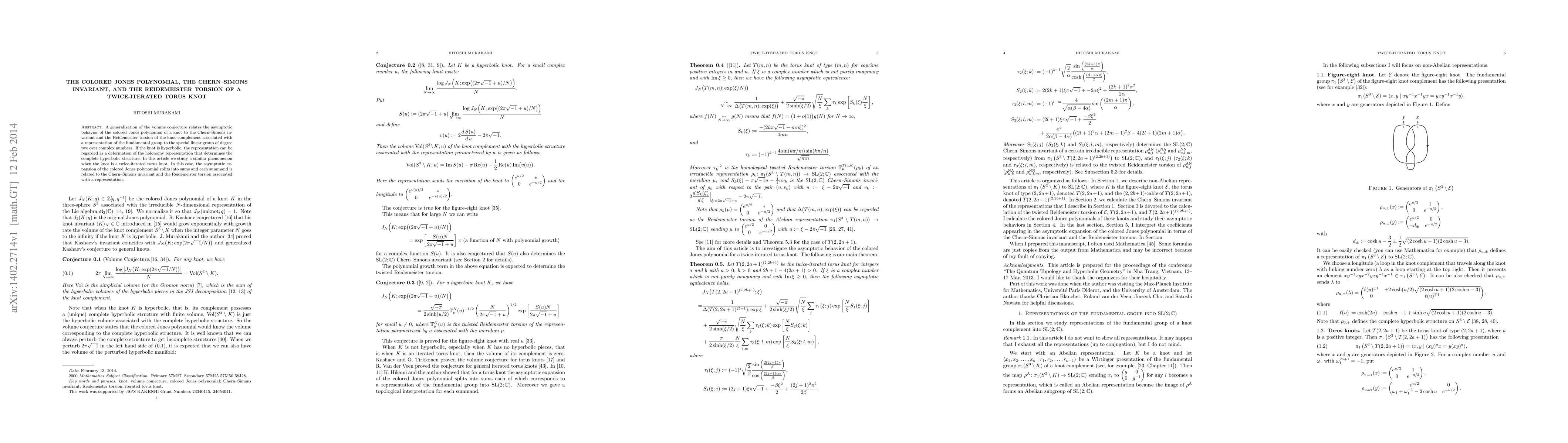 Summary: This paper examines the relationship between the asymptotic behavior of the colored Jones polynomial, the Chern-Simons invariant, and the Reidemeister torsion for twice-iterated torus knots. It explores how these invariants can be linked through representations of the knot's fundamental group to the special linear group.