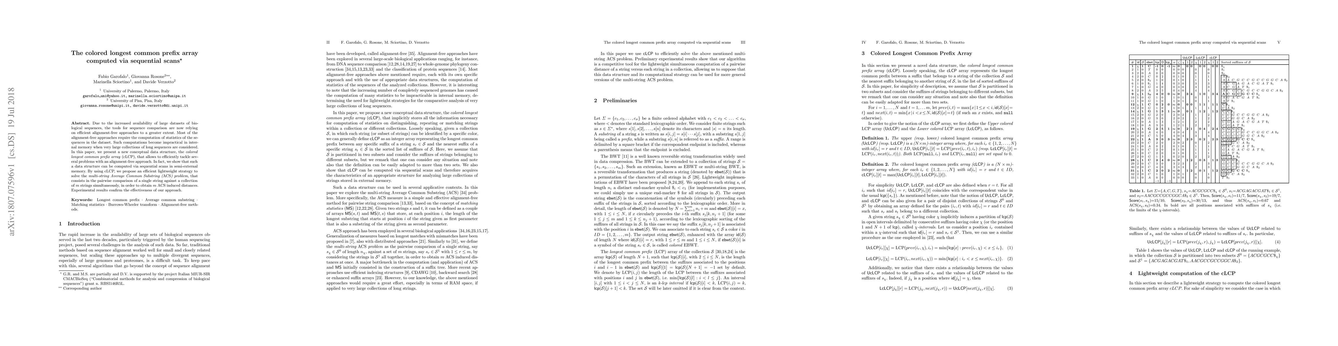 This paper introduces the colored longest common prefix array (cLCP), a new data structure for efficient alignment-free sequence comparison in large biological datasets. The cLCP can be computed via sequential scans in semi-external memory, enabling an effective solution to the multi-string Average Common Substring problem, with experimental results validating its efficiency.