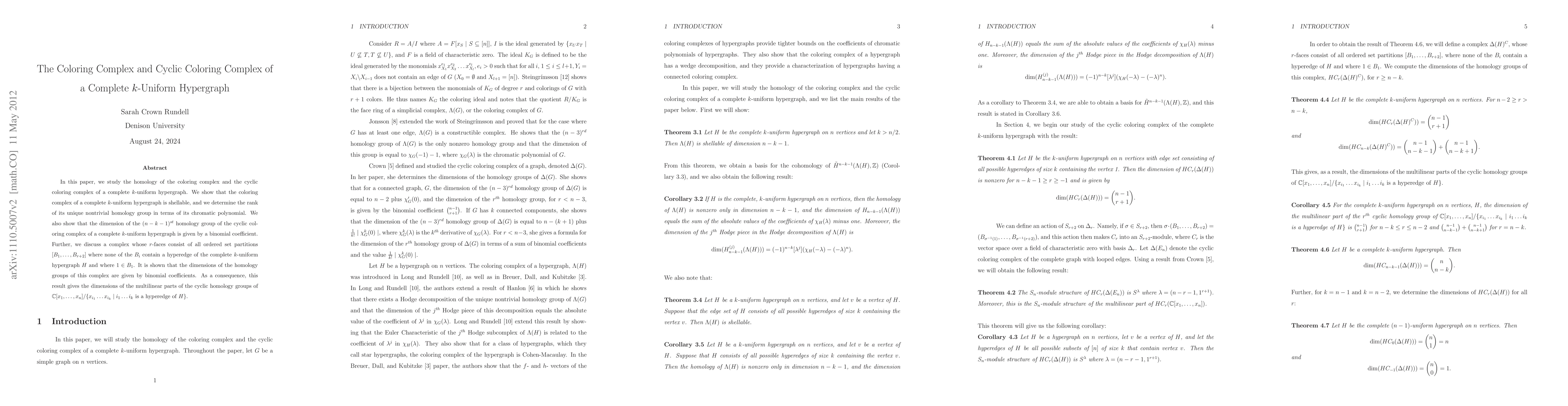 In this paper, we study the homology of the coloring complex and the cyclic coloring complex of a complete $k$-uniform hypergraph. We show that the coloring complex of a complete $k$-uniform hypergraph is shellable, and we determine the rank of its unique nontrivial homology group in terms of its chromatic polynomial. We also show that the dimension of the $(n-k-1)^{st}$ homology group of the cyclic coloring complex of a complete $k$-uniform hypergraph is given by a binomial coefficient. Further, we discuss a complex whose $r$-faces consist of all ordered set partitions $[B_1, \hdots, B_{r+2}]$ where none of the $B_i$ contain a hyperedge of the complete $k$-uniform hypergraph $H$ and where $1 \in B_1$. It is shown that the dimensions of the homology groups of this complex are given by binomial coefficients. As a consequence, this result gives the dimensions of the multilinear parts of the cyclic homology groups of $\C[x_1, \hdots, x_n]/ \{x_{i_1} \hdots x_{i_k} \mid i_{1} \hdots i_{k}$ is a hyperedge of $H \}$.