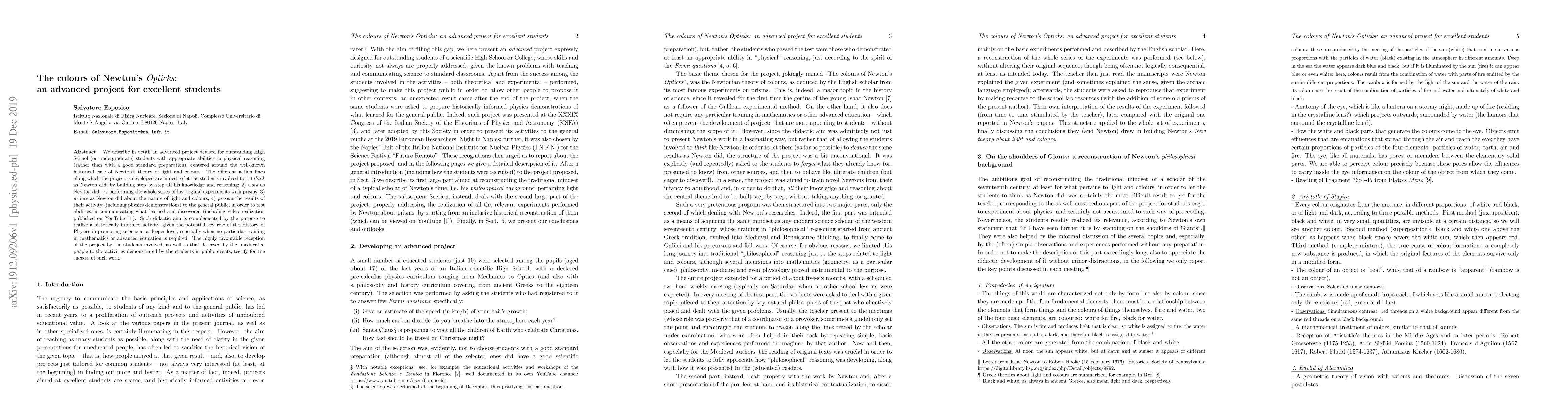 We describe in detail an advanced project devised for outstanding High School (or undergraduate) students with appropriate abilities in physical reasoning (rather than with a good standard preparation), centered around the well-known historical case of Newton's theory of light and colours. The different action lines along which the project is developed are aimed to let the students involved to: 1) think as Newton did, by building step by step all his knowledge and reasoning; 2) work as Newton did, by performing the whole series of his original experiments with prisms; 3) deduce as Newton did about the nature of light and colours; 4) present the results of their activity (including physics demonstrations) to the general public, in order to test abilities in communicating what learned and discovered (including video realization published on YouTube youtube). Such didactic aim is complemented by the purpose to realize a historically informed activity, given the potential key role of the History of Physics in promoting science at a deeper level, especially when no particular training in mathematics or advanced education is required. The highly favourable reception of the project by the students involved, as well as that deserved by the uneducated people to the activities demonstrated by the students in public events, testify for the success of such work.