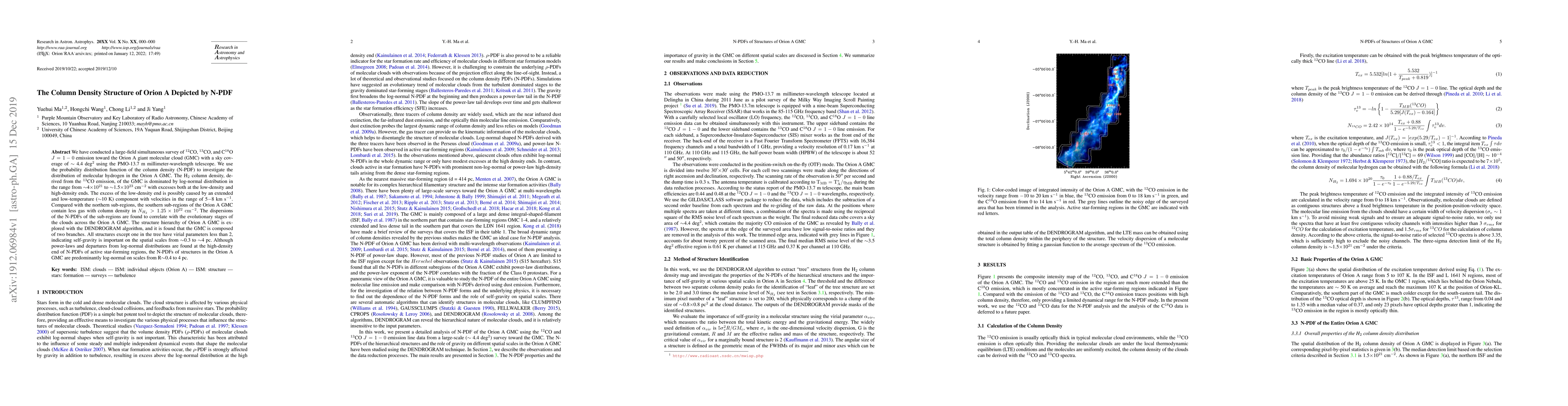 We have conducted a large-field simultaneous survey of $^{12}$CO, $^{13}$CO, and C$^{18}$O $J=1-0$ emission toward the Orion A giant molecular cloud (GMC) with a sky coverage of $\sim$ 4.4 deg$^2$ using the PMO-13.7 m millimeter-wavelength telescope. We use the probability distribution function of the column density (N-PDF) to investigate the distribution of molecular hydrogen in the Orion A GMC. The H$_2$ column density, derived from the $^{13}$CO emission, of the GMC is dominated by log-normal distribution in the range from $\sim$4$\times10^{21}$ to $\sim$1.5$\times10^{23}$ cm$^{-2}$ with excesses both at the low-density and high-density ends. The excess of the low-density end is possibly caused by an extended and low-temperature ($\sim$10 K) component with velocities in the range of 5$-$8 km s$^{-1}$. Compared with the northern sub-regions, the southern sub-regions of the Orion A GMC contain less gas with column density in $N_{H_2} > 1.25\times 10^{22}\ \rm{cm}^{-2}$. The dispersions of the N-PDFs of the sub-regions are found to correlate with the evolutionary stages of the clouds across the Orion A GMC. The structure hierarchy of Orion A GMC is explored with the DENDROGRAM algorithm, and it is found that the GMC is composed of two branches. All structures except one in the tree have virial parameters less than 2, indicating self-gravity is important on the spatial scales from $\sim$0.3 to $\sim$4 pc. Although power-laws and departures from log-normal distributions are found at the high-density end of N-PDFs of active star-forming regions, the N-PDFs of structures in the Orion A GMC are predominantly log-normal on scales from R$\sim$0.4 to 4 pc.