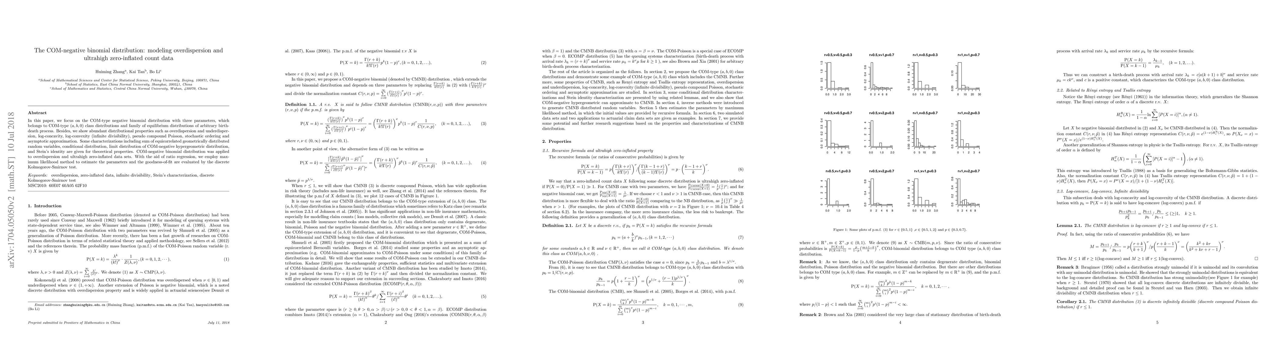 This paper introduces the COM-negative binomial distribution, a three-parameter model for overdispersion and ultrahigh zero-inflated count data, showcasing its properties and applications. It employs maximum likelihood estimation and the discrete Kolmogorov-Smirnov test to evaluate model fit.