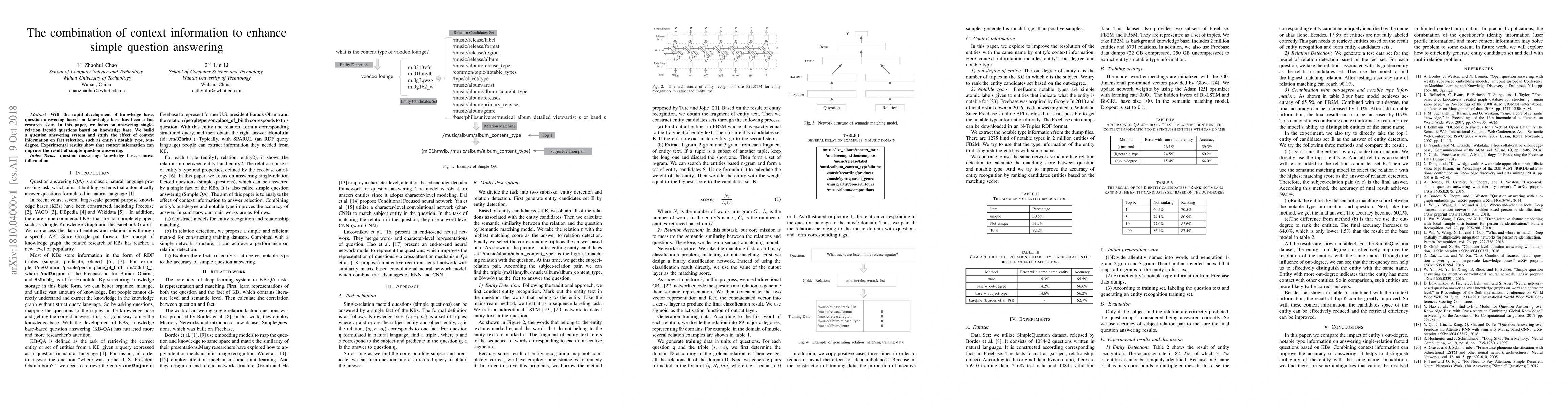 This paper develops a question answering system for single-relation factoid questions, exploring how context information like entity types and outdegrees enhances fact selection. Experimental results demonstrate that incorporating context information significantly improves simple question answering accuracy.