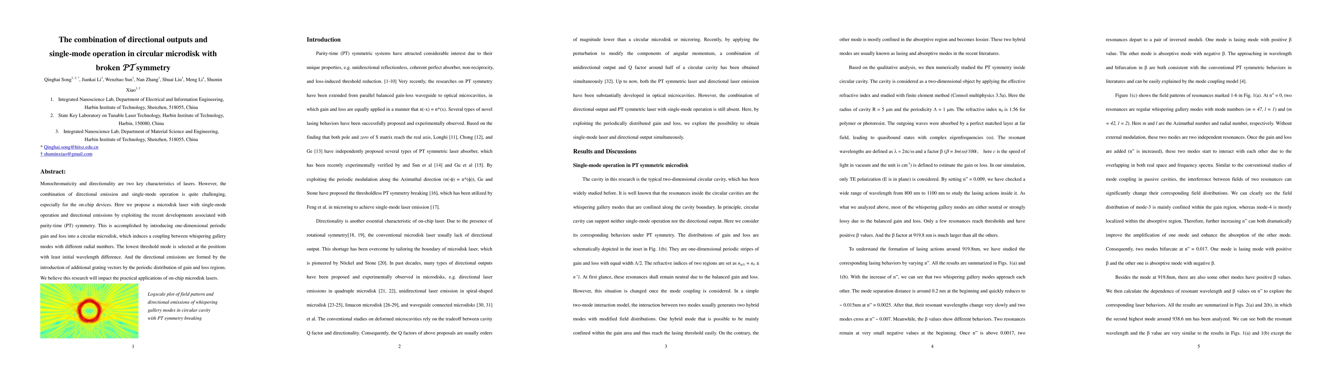 This paper proposes a microdisk laser that achieves both directional emission and single-mode operation using broken PT symmetry, achieved by introducing periodic gain and loss to couple different radial modes. This innovation could enhance the practical applications of on-chip microdisk lasers.