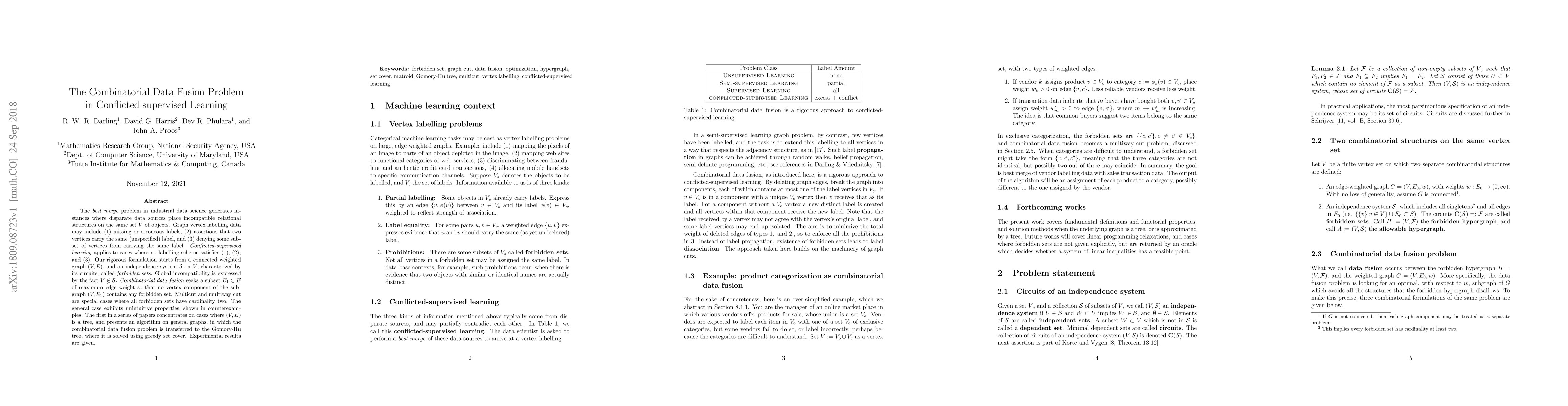 The best merge problem in industrial data science generates instances where disparate data sources place incompatible relational structures on the same set $V$ of objects. Graph vertex labelling data may include (1) missing or erroneous labels,(2) assertions that two vertices carry the same (unspecified) label, and (3) denying some subset of vertices from carrying the same label. Conflicted-supervised learning applies to cases where no labelling scheme satisfies (1), (2), and (3). Our rigorous formulation starts from a connected weighted graph $(V, E)$, and an independence system $\mathcal{S}$ on $V$, characterized by its circuits, called forbidden sets. Global incompatibility is expressed by the fact $V \notin \mathcal{S}$. Combinatorial data fusion seeks a subset $E_1 \subset E$ of maximum edge weight so that no vertex component of the subgraph $(V, E_1)$ contains any forbidden set. Multicut and multiway cut are special cases where all forbidden sets have cardinality two. The general case exhibits unintuitive properties, shown in counterexamples. The first in a series of papers concentrates on cases where $(V, E)$ is a tree, and presents an algorithm on general graphs, in which the combinatorial data fusion problem is transferred to the Gomory-Hu tree, where it is solved using greedy set cover. Experimental results are given.