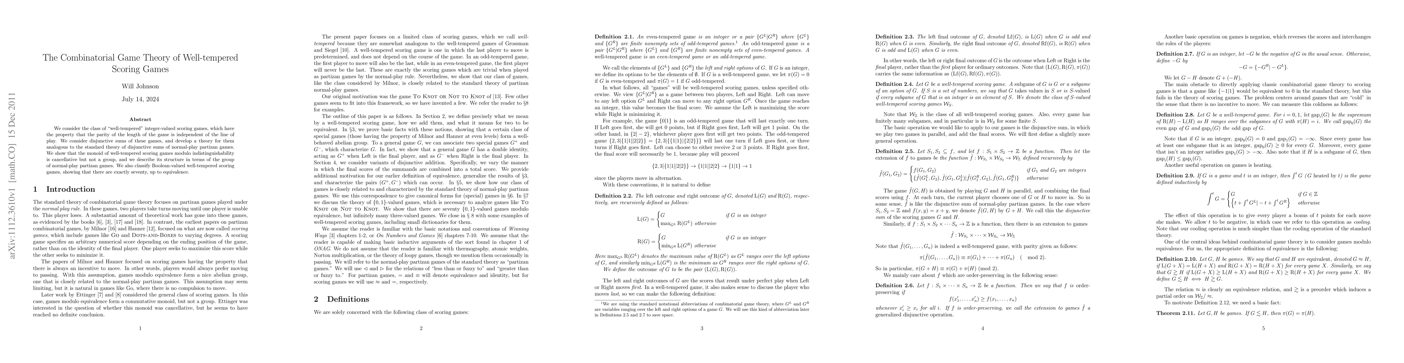 This paper develops a combinatorial game theory for "well-tempered" scoring games, demonstrating their disjunctive sum properties and classifying Boolean-valued variants, revealing seventy distinct equivalence classes. The monoid of these games is shown to be cancellative but not a group, structurally linked to normal-play partizan games.