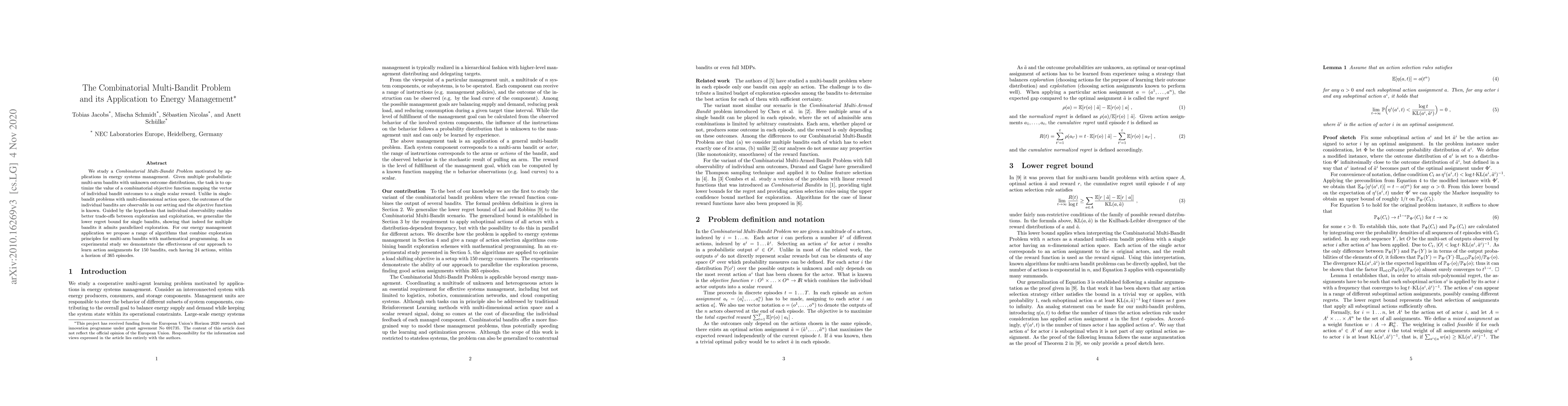 We study a Combinatorial Multi-Bandit Problem motivated by applications in energy systems management. Given multiple probabilistic multi-arm bandits with unknown outcome distributions, the task is to optimize the value of a combinatorial objective function mapping the vector of individual bandit outcomes to a single scalar reward. Unlike in single-bandit problems with multi-dimensional action space, the outcomes of the individual bandits are observable in our setting and the objective function is known. Guided by the hypothesis that individual observability enables better trade-offs between exploration and exploitation, we generalize the lower regret bound for single bandits, showing that indeed for multiple bandits it admits parallelized exploration. For our energy management application we propose a range of algorithms that combine exploration principles for multi-arm bandits with mathematical programming. In an experimental study we demonstrate the effectiveness of our approach to learn action assignments for 150 bandits, each having 24 actions, within a horizon of 365 episodes.