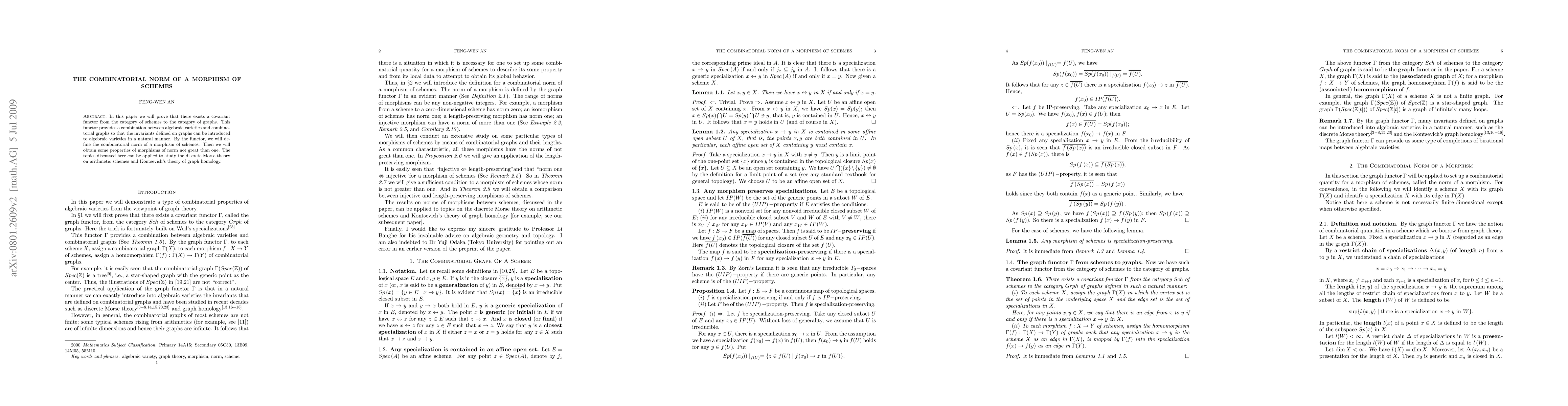 In this paper we will prove that there exists a covariant functor from the category of schemes to the category of graphs. This functor provides a combination between algebraic varieties and combinatorial graphs so that the invariants defined on graphs can be introduced to algebraic varieties in a natural manner. By the functor, we will define the combinatorial norm of a morphism of schemes. Then we will obtain some properties of morphisms of norm not great than one. The topics discussed here can be applied to study the discrete Morse theory on arithmetic schemes and Kontsevich's theory of graph homology.